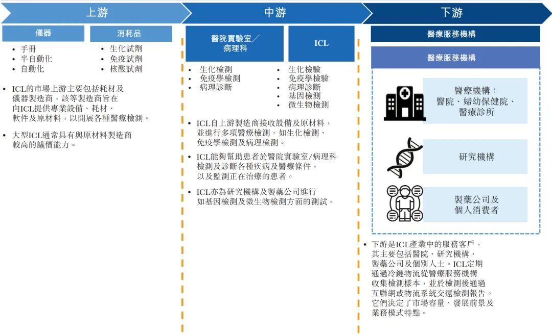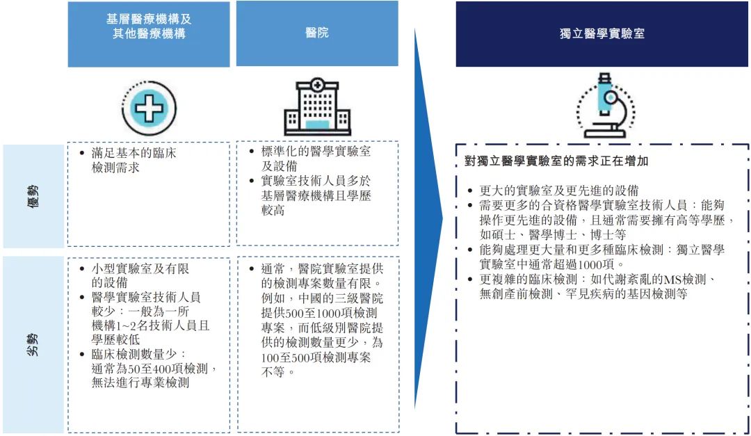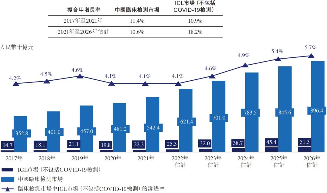 1.1 临床诊断检测简介 临床诊断检测是在实验室进行的医疗检测,旨在提供有关某一人士健康状况的资料。这一资料可协助医生针对病患护理作出精确及个人化的诊断决策。 根据弗若斯特沙利文的资料,大约70%至80%的临床决策乃以某些形式的实验室检测为基础。此外,临床检测亦能够协助制药及生物技术公司研发新药及疫苗,支持私营企业雇主检测其雇员的酒精及药物滥用情况,并帮助保险公司评估与申请人健康状况有关的风险。 临床诊断检测通常由三类提供商进行,即医院实验室、独立医学实验室或ICL及其他(如医生办公室、疗养院及门诊手术中心),其中,就收益及检测量计,医院实验室为最大的医学检验服务提供商。 医院实验室通常仅为其自身住院病人提供检测,而另一方面,ICL独立于医院,自大量医院及研究机构接收样本进行分析。相较于医院实验室,ICL的规模通常较大。ICL通常拥有更先进的设备及技术上更训练有素的实验室人员,使得彼等能够以更具成本效益的方式进行专业检测及大量测试。 根据弗若斯特沙利文的资料,医院实验室的测试目录通常拥有约800项测试项目,大部分为普检项目,可满足一家医院就诊患者的基本诊断需求,而ICL通常能够提供检测1,000多项测试项目,包括涵盖专业特检在内的各种检测类型。 下图概述中国临床检验服务提供商的优势及劣势。 ICL是经卫生行政部门许可,具有从事临床或病理试验服务资格的独立法人实体。 中国ICL产业的发展可分为五个阶段:起步阶段(1980年代至1994年)、探索阶段 (1994年至2004年)、初步发展阶段(2004年至2016年)、快速发展阶段(2016年至2019 年)及加速发展阶段(2019年至今) 1980年代以前,中国的医疗诊断服务均由医疗机构的临床实验室及病理科提供。 随着诊断技术的发展及临床需求的变化,中小型医院由于能力有限而无法进行全面的检测,从而导至需要将患者的样本转移至大型医院进行诊断。 1980 年代中期,扬州临床检验中心开始提供体检服务。 后来,随着医疗服务市场的不断开放,一些检验服务中心开始与医院合作,形成单体ICL,仅提供有限的检测,并未规模效益。 1994年,中国第一家ICL成立,附属于一所医学院。自1994年至2004年,中国ICL产业开始缓慢发展。 2004 年,卫生部在中国举办了第一届ICL 研讨会,汇集了中国各地的医学专家、医疗器械及试剂供货商。此后,国内一大批ICL 及连锁机构相继成立。 2009年,卫生部颁布《医学检验所基本标准(试行)》,正式承认ICL的合法地位,此后该行业经历了显著增长。自2014年以来,ICL行业进入创新发展的新阶段,中国的ICL规模开始迅速扩大。 2015 年9 月8 日,国务院办公厅颁布《关于推进分级诊疗制度建设的指导意见》,指导各地就提供诊断及医疗服务推进分级诊疗制度建设。随着该等政策的实施,ICL市场持续增长。 快速发展阶段(2016年至2019年) 2016 年,国家卫生健康委员会颁布《医学检验实验室基本标准和管理规范(试行)》,鼓励发展连锁ICL及应用检验新技术,推动特检市场扩张。 2018 年,国家卫生健康委员会出台公立医院医学检验服务可外包予第三方医疗机构的政策,推动ICL市场的进一步增长。 加速发展阶段(2019年至今) 为应对2019 年底暴发的COVID-19疫情,政府出台了多项关于规范ICL管理及质量控制系统的规定,以提高其准确性及一致性。 2021年3月,国务院颁布《医疗器械监督管理条例》,规定对于国内尚无同品种产品上市的体外诊断试剂,符合条件的医疗机构可以根据其自身实验室的临床需要自行研制,并在合资格医务人员的指导下于其自身的实验室内使用。此条例可被视为对临床实验室自建项目(或LDT)的有利政策。由于需求增加及政策利好,中国ICL的数量自2009年的不足70个增加至2021年的2,100多个。 第二章 中国ICL市场的规模及增长动力 2.1 中国ICL市场的主要增长动力 中国ICL市场的增长受到并将继续受到以下关键因素的推动: 中国人口快速老龄化,于2017 年至2021 年65 岁以上的人口数量以6.1%的复合年增长率增长,预计于2021年至2025年将以5.4%的复合年增长率进一步增长,并于2025年底达到247.1 百万。中国严重的老龄化问题已直接导至慢性病患病率激增及重病患者数量增加,这两者已经并将继续推动检测需求,从而提高检测量。 此外,健康意识的增强及慢性病病例的激增促使人们尽早发现并采取主动预防措施。中国体检行业以4.3%的复合年增长率增长,由2017年的人民币1,183亿元增长至2021年的人民币1,400亿元,预计于2026年达到人民币1,784亿元。中国体检人数于2021年达到447.4百万,预计将以4.4%的复合年增长率增长至2026年的521.1百万。受不断增长的客户需求的推动,健康体检中心的外包检测率不断提高,因为其受到激励寻求以优质质量进行的具有成本竞争力的检测。 此外,精准医疗领域的不断发展及新技术的出现亦极大地刺激中国ICL 市场的发展。精准医疗是一种医学模型,提出针对患者亚组的医疗决策、治疗、试验或产品的个人化,而非一刀切的模型。精准医疗有望将药物及治疗重点从反应转向预防,提高疾病检测能力并预防疾病发展,从而推动对更精准及更优质的医疗服务的需求。 2015 年,科技部首次召开「国家精准医疗战略专家会议」,代表中国在战略层面进入「精准医疗」时代。 ICL于精准医疗时代变得越来越重要。 其将在很大程度上帮助医生整合来自临床因素、实时监