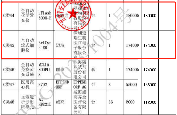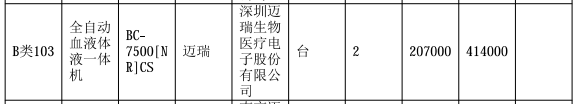 2023年5月6日,中国政府采购网发布信息,酒泉市人民医院新院区医疗设备设施购置筹资项目中标公告。其中标金额高达3.49亿! 一、项目编号 JQZFCG-2023-1004号 二、项目名称 酒泉市人民医院新院区医疗设备设施购置筹资项目 三、中标(成交)信息 供应商名称:甘肃平安正和医疗科技有限公司、平安点创国际融资租赁有限公司 中标金额(万元):34923.989万元 六、代理服务收费标准及金额 收费标准:按中华人民共和国国家计划委员会发布的《招标代理服务收费管理暂行办法》(计价格[2002]1980号),在标准取费的基础上下浮10%收取。 收费金额:49.37万元 根据公布的信息,此次招标中标金额3.49亿元,中标服务费达到49.37万元,创历史新高。 根据招标文件,酒泉市人民医院新院区医疗设备购置为二次招标 一、项目基本情况: 项目编号:JQZFCG-2023-1004号 项目名称:酒泉市人民医院新院区医疗设备设施购置筹资项目(二次) 预算金额:349247430元(人民币) 大写:叁亿肆仟玖佰贰拾肆万柒仟肆佰叁拾元整人民币 最高限价:349247430元(人民币) 采购需求:酒泉市人民医院新院区设备配置、总务后勤物资配置及安防设备配置(具体内容详见招标内容) 合同履行期限:详见《招标文件》 本项目接受联合体投标: 本项目接受联合体投标,以联合体投标的,组成联合体的成员数量上限为2家。联合体投标的,鼓励联合体由设备供应商和融资公司组成。联合体各方在同一招标项目中以自己名义单独投标或者参加其他联合体投标的,相关投标均无效。(具体要求详见招标文件) 酒泉市人民医院新院区计划2023年8月开始搬迁。新院区所需医疗设备、总务后勤设备(物资)、安防设备等需同步配置到位。为了保证新院区如期投入运行,为人民群众提供更优质高效的医疗服务,现通过招标方式确定设备供应商,向医院提供预算总价为34924.743万元的医疗设备、总务后勤设备(物资)及安防设备等。 鉴于项目所需资金较大,鼓励融资公司参与项目投标,投标人可由联合体(设备供应商牵头并联合融资公司组成联合体)参与本项目投标。医院分8年32期向中标人等额支付项目资金,医院不承担中标人项目资金产生的利息及相关费用。 1.投标人在制作投标文件第 7 项“招标内容及技术规格偏离表”时,内容填写为“具体内容详见附表 7.1-7.5”。 备注: (1)配置清单内推荐的品牌,仅作为投标参考,不作为中标条件。 (2)备注栏注明“国产”的产品不接受投标人选用进口产品参与投标; 注明“进口”的产品允许投标人选用进口产品参与投标,但不排斥国内产品。 (3)进口产品是指通过海关验放进入中国境内且产自关境外的产品。即所谓进口产品是指制造过程均在国外,如果产品在国内组装,其中的零部件(包括核心部件)是进口产品,则应当视为非进口产品。采用“进口”的产品优先采购向我国企业转让技术、与我国企业签订消化吸收再创新方案的供应商的进口产品,相关内容以财库〔2007〕119 号文和财办库〔2008〕248 号文的相关规定为准。 针对生化免疫流水线: 1、样本进样区 架式进样单元一套,进样单元容量≥400管,进样单元纯进样处理速度≥750样本/小时; 需含优先进样区,处理速度≥600样本/小时; 架式进样单元能容纳不同规格的样本管进样,包括75mm&100mm样本管; 2、去盖单元 去盖单元一套,能对识别后的样本自动去盖,能去除多种类型的试管盖; 每个去盖单元去盖速度≥600样本/小时; 3、离心单元 配置低温离心机一台,每台离心机速度≥280管/小时; 离心机机械臂从轨道上单次抓取样品管≥5管; 具有智能自动平衡功能; 4、出样单元 出样单元一套,每个出样单元容量≥400管; 出样单元分类及出样速度≥750管/小时,可连续出样; 5、轨道传输系统 ◆主传输轨道为磁悬浮轨道,样品管在轨道上单管传输; 生化模块:最小检测模块光学速度≥2000测试/小时,总光学速度≥4000测试/小时;在线离子速度≥1200测试/小时; 发光模块:单机或单模块最大测试速度≥500测试/小时,总测试速度≥1000 测试/小时; 生化免疫流水线迈瑞中标,M6000,中标金额450万元;血液分析流水线迈瑞中标,CAL8000,中标金额100万;检验科装修,中标金额500万元。 由于数量较多,不一一列举,但从粗略统计来看,迈瑞是此次的大赢家,统计表来看,迈瑞中标38项,总金额4000万以上。 从中标来看,此次招标,大型设备依然被进口厂家垄断,就检验设备来看,国产占据主流,其中流水线和部分单机,基本能实现国产替代。 本项目详细中标文件 请扫描下方二维码查看 |