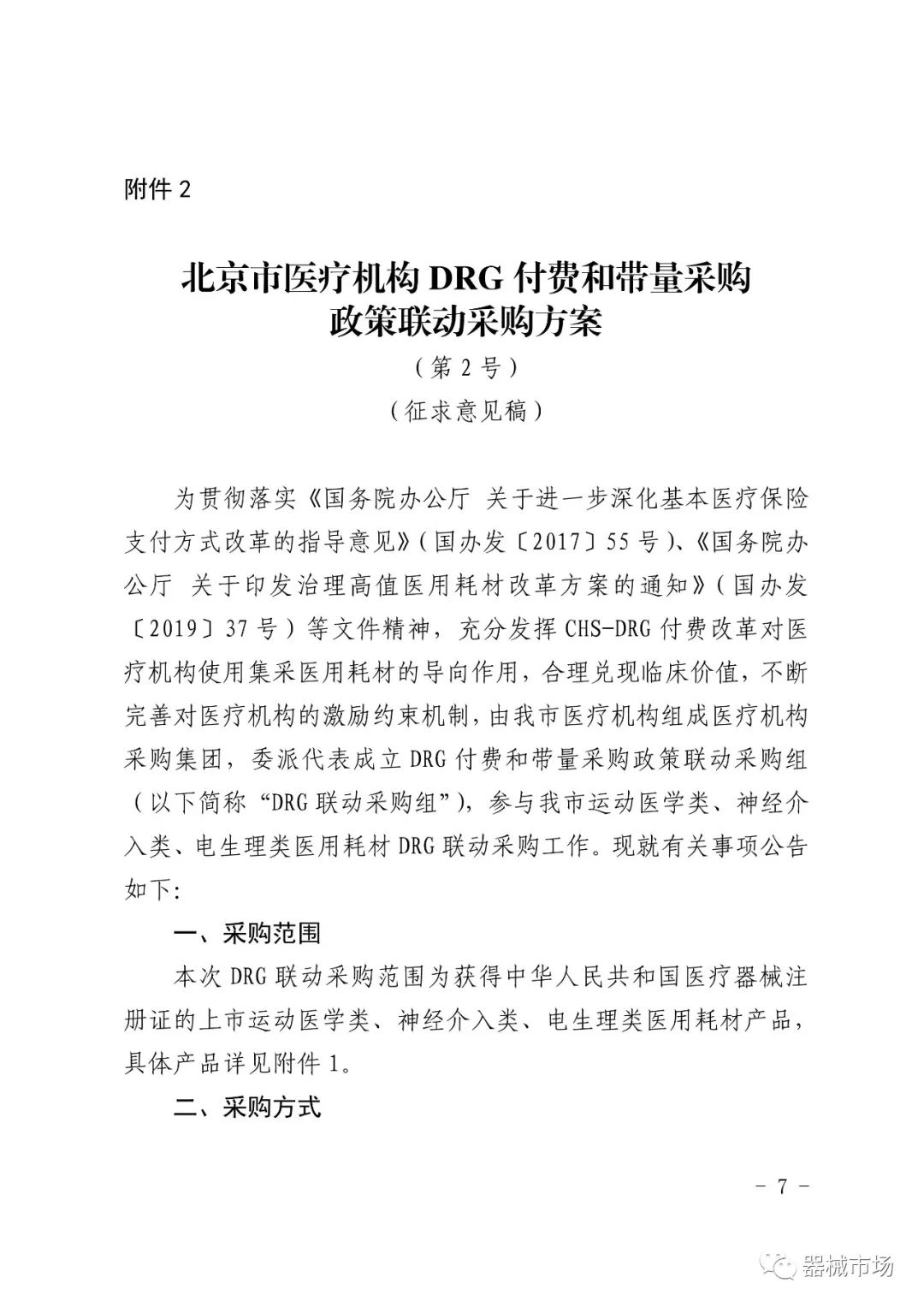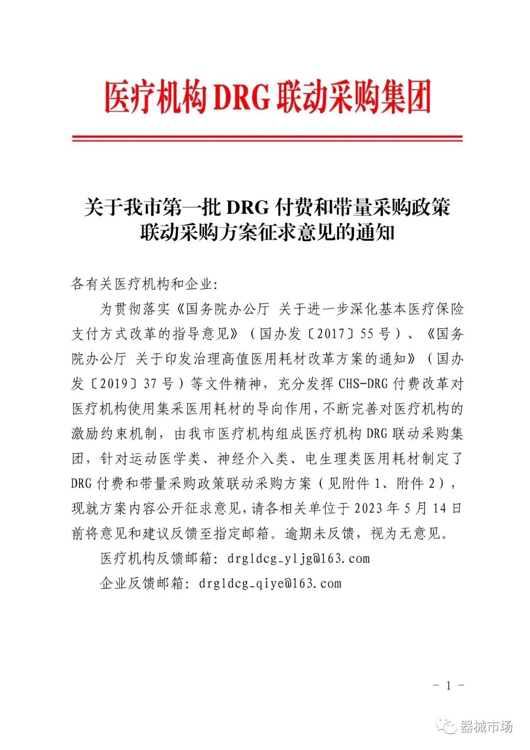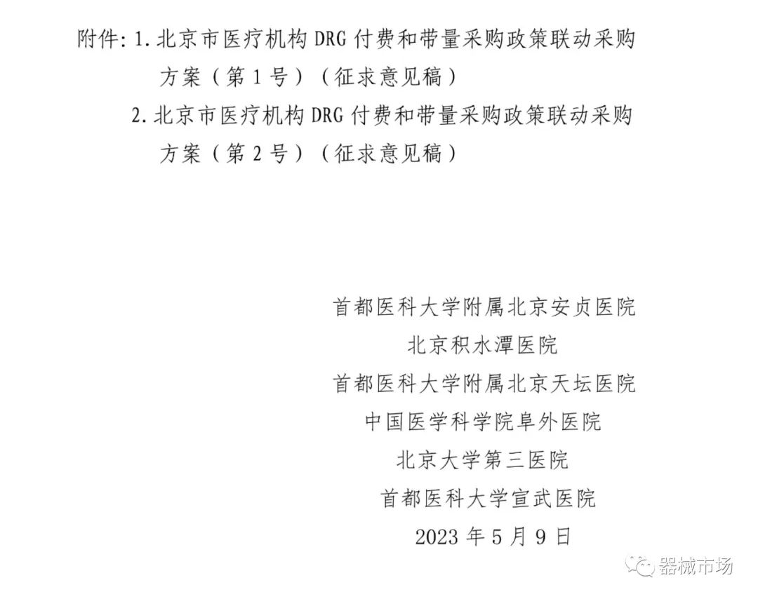 转载要求:请在文首标明文章来源,可直接转载 2023年5月10日,北京市医保局发布了《关于我市第一批 DRG 付费和带量采购政策联动采购方案征求意见的通知》。(以下简称《通知》,文末附全文) 由北京市医疗机构组成医疗机构DRG联动采购集团,针对运动医学类、神经介入类、电生理类医用耗材制定了DRG付费和带量采购政策联动采购方案。 《通知》指出,为充分发挥CHS-DRG付费改革对医疗机构使用集采医用耗材的导向作用,不断完善对医疗机构的激励约束机制,制定了此方案。 发布机构为北京六家顶级三甲医院: 首都医科大学附属北京安贞医院、北京积水潭医院、首都医科大学附属北京天坛医院、中国医学科学院阜外医院、北京大学第三医院、首都医科大学宣武医院 三类耗材采购周期均为1年,如有其他省级(省际联盟)同类产品带量采购中选结果产生,则就低联动执行。意见征求时间截止至2023年5月14日。