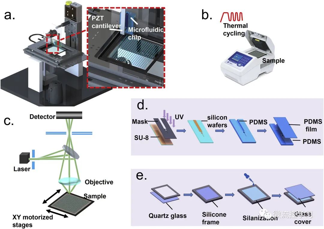 图1:微流控打印液滴数字PCR装置(MIP-ddPCR装置)的示意图,该装置由(a)微流控打印机,(b)平板热循环仪和(c)荧光显微镜组成。(d)一次性微流控打印芯片的制造过程和(e)疏水性石英基板的制造过程的示意图[2]。