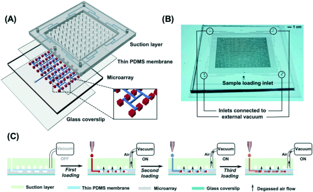图3:多步进样芯片设计及工作原理。(A)我们的多层PDMS器件是由一个吸层,一个薄PDMS膜,一个微阵列层和一个玻璃盖玻片组装而成。所述吸力层具有具有微柱阵列以防止所述腔塌陷的大腔。该微阵列由12级分叉通道和4096个终端微室组成。(B)吸引层上的四个入口连接到外部真空以在微阵列内产生长期负压并因此促进样品加载过程。该设备的大小约为45毫米× 40毫米。(C)基于微阵列的多级分叉结构,通过在每个步骤中向芯片中引入分数体积的样品,直到所有微室被完全填充,实现了多步骤和多试剂加载[3]