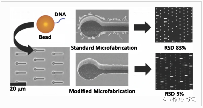 图5,B.F.M.Riley等人建立了一种新的微细加工程序,用来为基于微珠的dPCR创建超低容量 (100 fL ) 孔,该程序创建原始微流控阵列,使用双重工艺去除正抗蚀剂,并完全放弃使用负抗蚀剂,从而实现与理论预测匹配的数字信号的稳健放大,使原始设备表现出强大的dPCR扩增能力。通过量化设备内和设备间的异质性,表明微加工过程显著影响微流控微孔阵列中基于微珠的dPCR测定的精度。这项工作的结果表明了设备处理对下游分析性能的影响,有助于提高基于微珠的dP CR测定在未来生物学研究中的可重复性[1]。