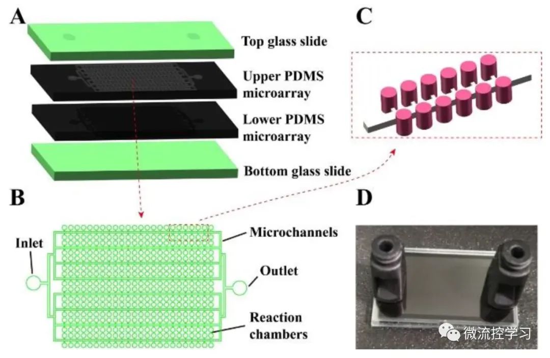 图4:双层微流控芯片。(A)分层芯片结构示意图。(B)微流控数字PCR(dPCR)芯片示意图。(C)芯片细节图。(D) 原型设备的照片。芯片尺寸为 35 毫米× 20 毫米[4]。