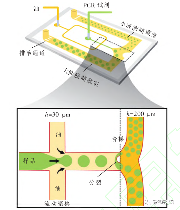 早期开发的ddPCR平台使用微流控流动聚焦方法产生单体积液滴用于PCR分析。但是dPCR分析中使用的液滴具有相同的体积,检测的动态范围相对较窄,在处理浓度差异较大的样品时,需要大量的液滴,从而影响读出时间和芯片的小型化。多体积方法由于其宽动态范围特性而在ddPCR领域引起了广泛关注[1]