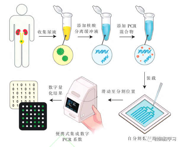 基于微流控的数字PCR技术的实现方式除了前文所述之外还有很多,L.Xu等人设计了一种便携式集成数字PCR(PI-dPCR)系统,可以直接从人类尿液样本中对多瘤(BK)病毒载量进行数字量化检测。该系统带有自分区滑动芯片微流控装置,这种数字自分区滑动芯片微流控利用滑动诱导的自分配机制,通过简单的滑动操作生成大量水滴,利用包含由浅而窄的桥通道连接的微孔的微通道进行流体加载。PI-dPCR系统占用面积小、质量轻,并且与热控制和荧光成像模块集成,与需要在接触表面上精确重叠微特征以建立流体加载路径的传统滑动芯片设备不同,这种自分区滑动芯片设备利用具有交替深度和宽度的微通道进行流体操作。该系统还可以通过简单的“样本到数字结果”操作流程,直接从原始尿液样本中量化BK病毒。PI-dPCR系统定量分析尿液样本中BK病毒载量的工作流程如图7所示,无需复杂的核酸提取和纯化步骤,它为在现场快速检测和监测病毒感染提供了一种有前途的方法[1]