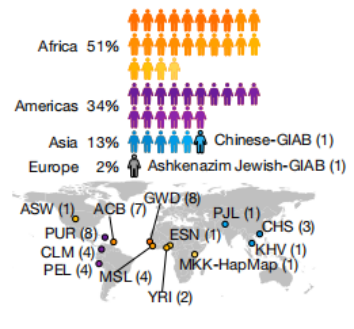 此次,顶尖学术期刊《自然》以专题形式发布首个人类泛基因组参考草图问世的系列报道(包含3篇论文),另有第4篇论文发表于《自然-生物技术》。 在这一专题合集中,人类泛基因组参考联盟(Human Pangenome Reference Consortium)提出了首个人类泛基因组参考草图的构建和使用方法,并报告了使用该图谱获得的两项新发现。 02 为什么需要更多样化的参考基因组或许大家会好奇,此前更多提到的是人类基因组参考序列,泛基因组参考序列究竟是什么、有什么用? 泛基因组概念最早于2005年在细菌中提出,2007年在研究植物如玉米中单拷贝序列和LTR中应用。直到2014年,在三代测序技术的助力下,植物泛基因组也迎来了黄金发展期。同年,首篇植物大豆的泛基因组发表,开启了植物泛基因组研究历程,随后玉米、水稻、甘蓝、芝麻、向日葵和番茄等物种的泛基因组研究相继发表在各大期刊。 随着多种植物参考基因组的不断公布及同种不同个体植物基因组间的相互比较,人们逐渐认识到单一参考基因组不能代表物种的多样性,这导至了泛基因组概念的产生。 泛基因组参考序列比传统的参考序列数据更加丰富,不仅可以获得多个个体基因组,完善该物种的基因集,还可以获得种群甚至个体特有的DNA序列和功能基因的信息,为系统进化分析及功能生物学研究奠定基础。 事实上,参与构建新人类泛基因组参考的个体最初就是作为“1000基因组计划”的一部分进行招募的,该计划是一个国际性合作,旨在改善不同人群的基因组变异目录,因此研究人员筛选出了不同族群的个体基因组数据,用来更准确地反映全球各种族群之间的遗传变异。因此47人中当然考虑了中国人的遗传特征。 图片来源:ErnestodelAguila lll,国立卫生研究院国家人类基因组研完所 (https.//wwwgenome.gov). 不光是样本容量更丰富,数据也得到了进一步整合分析。以往的人类基因组中存在大量重复序列和其他难以读取的区域。 此次,此次研究人员利用了最新测序技术和算法工具,长读长测序技术也在其中发挥独特优势帮助填补了以往参考序列中缺失的序列,这让研究人员更好地理解了人类基因组的多样性,并且发现了以前未被发现的基因变异与人类健康之间的关系。 新的泛基因组参考便提供了更多样化、也更准确的标准。研究人员通过复杂的算法,将组装完成的单个基因组序列集合编译为图形结构。如果过去的参考基因组只是一根线,现在的人类泛基因组参考是多个基因组序列的多线并行图。在碱基完全相同的区域,它还是单线形式;而存在人群差异的序列部分,线条则从一根“分化”出地铁轨道般交错的多根,提供了更广泛的参考选择。 泛基因组管状图谱,图片来源:Darryl Leja 人类泛基因组参考联盟的主要研究者之一、德国海因里希海涅大学(Heinrich Heine University)的Tobias Marschall教授指出:“人类泛基因组参考是我们已经等待了十年的一个里程碑,这是在测序技术和生物信息学方面取得了诸多创新后才得以达成的。” 03 泛人类基因组草图亮点新草图参考纳入了T2T的完整基因组序列,还拓展了多样性上的新维度,结合来自不同祖源的47个个体的遗传信息,比现有的单一参考基因组序列(GRCh38)新增1.19亿个碱基对和1115个基因重复(一个DNA区域里含有一个基因重复的变异)。 47位自愿者来自世界各地,图片来源网络 与原先的人类基因组草图相比,此次公布的泛基因组草图,检测到结构变异的数量增加了104%,为人类基因组遗传多样性提供了更完整的图景。 除了结构变异的检测率提高外,检测较小的遗传变异(例如只有一个或数个碱基差异)时,使用泛基因组参考的准确性也有34%左右的提高。 这为人类基因组遗传多样性提供了更完整的图景,也更能代表人类这个物种的遗传多样性,应用这一参考图谱能极大提高对人类基因组中变异体的检测。 最新的泛基因组参考图谱还有一项重大突破。我们的染色体成对存在,一套遗传自母亲,一套遗传自父亲,而泛基因组参考包括的单倍型信息——来自47个人的94套基因组序列,可以在分析一个人的基因组时更准确地区分出来自父母的不同染色体。这也将帮助我们更好地理解各种基因和疾病的遗传方式。