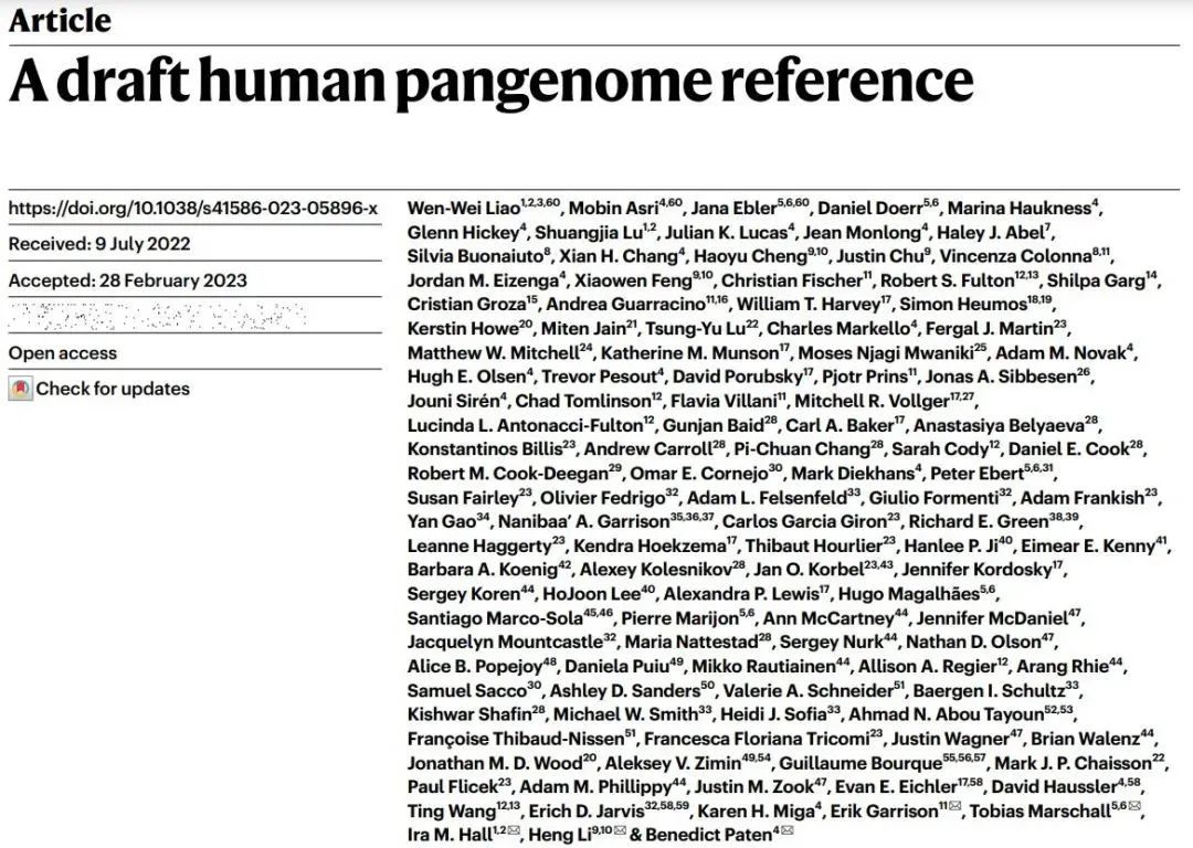 5月10日,人类遗传学研究迎来了又一里程碑:首个人类泛基因组参考(human pangenome reference)草图在最新一期《自然》上发布! 这份草图结合了来自47个不同祖源的个体遗传信息,比现有的单一参考基因组序列(GRCh38)新增1.19亿个碱基对,并计划在未来扩展到350个人。 此次研究人员利用了最新测序技术和算法工具,长读长测序技术也在其中发挥独特优势帮助填补了以往参考基因组序列中缺失的序列。 这份泛基因组参考草图的问世,意味着我们将更全面、更准确地了解全世界人类的基因组多样性。未来基因组学研究或许迎来一个新的发展期。 最新一期《自然》封面专题(图片来源:Darryl Leja/NHGR) 01 人类科学史伟大工程的腾飞自30多年前,人类基因组计划(Human Genome Project, HGP)首次提出,随着测序技术的飞速发展,从破译“生命天书”的人类基因组图谱,到试图“书写”生命密码的基因组合成,人类对生命的认识不断实现跨越。 让我们一同先回顾这项人类科学史上伟大工程发展历程上的精彩历史时刻: 1990年 人类基因组计划(Human Genome Project, HGP)正式启动,被誉为生命科学的“登月计划”。 2001年 人类基因组计划(Human Genome Project)发布了第一版人类参考基因组工作草图。 2003年 人类基因组计划的测序工作基本完成,获得了占人类基因组90%以上的序列。 2022年 依托长读长测序技术的发展,帮助获得更完整的基因组序列,填补了人类基因组最后8%的空白。 “端粒到端粒”联盟(T2T)建出了第一个完整的人类参考基因组(被命名为T2T-CHM13)。 上述这些都是单个参考基因组的不断升级。原有参考基因组序列的一个重要局限在于,它是由大约20个志愿者的遗传数据拼凑组成的一套基因组,大部分参考序列(约70%)实际上只来自一个志愿者。