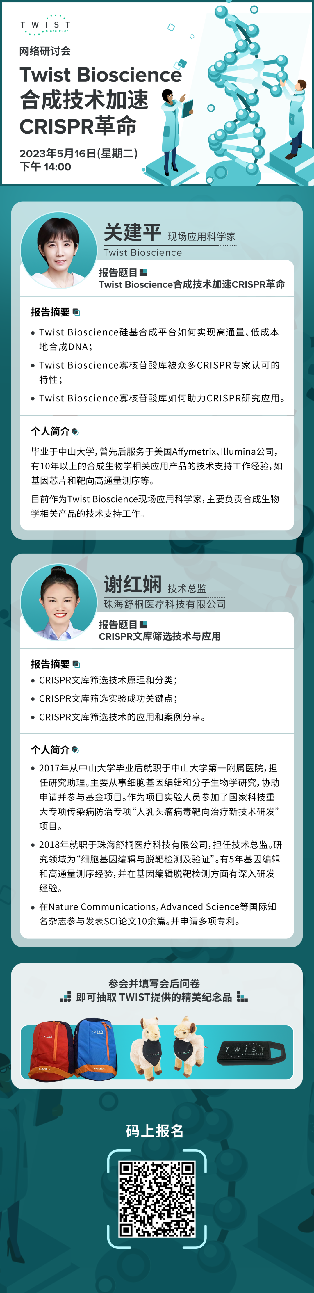 诚邀您参加于2023年5月16日下午14:00举行的“Twist Bioscience合成技术加速CRISPR革命”网络研讨会,我们将向您介绍Twist Bioscience硅基DNA合成技术如何助力您提高CRISPR筛选效率,以及拓宽CRISPR应用。同时,我们还特别邀请了在基因编辑领域深耕多年的珠海舒桐医疗科技向大家分享他们在CRISPR文库技术筛选应用方面的经验。