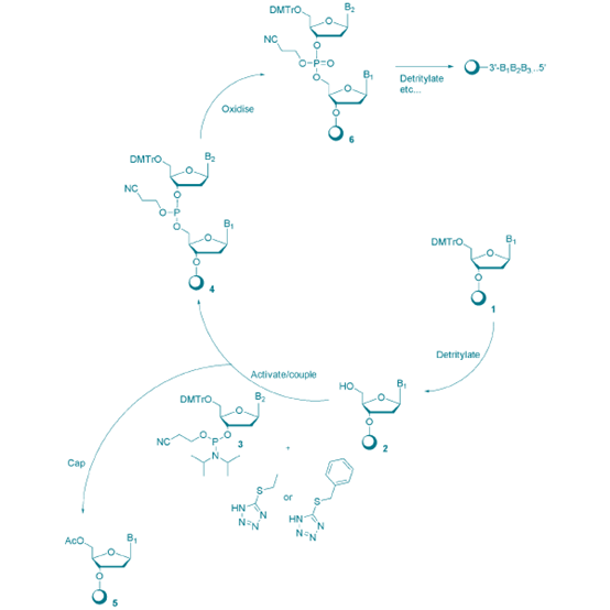 DNA化学合成不同于酶促的DNA合成过程从5’→3’方向延伸,而是由3’端开始。先将酸活化的脱氧核苷亚磷酰胺分子耦合到一个固定在固相(一般是硅材质表面)的脱氧核苷酸分子上。在第一个合成循环中,核苷酸链从第一个固定在表面上受保护的核苷酸分子开始延伸。其中,经常采用的固定化表面主要是可控孔度玻璃( CPG)或者聚苯乙烯微珠(PS beads)。试剂被泵入并流经材质表面,诱导分步添加的核苷酸单体加入到寡核苷酸链上,使寡核苷酸链不断延长。