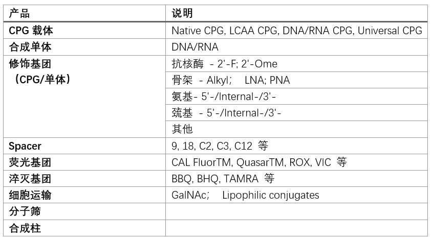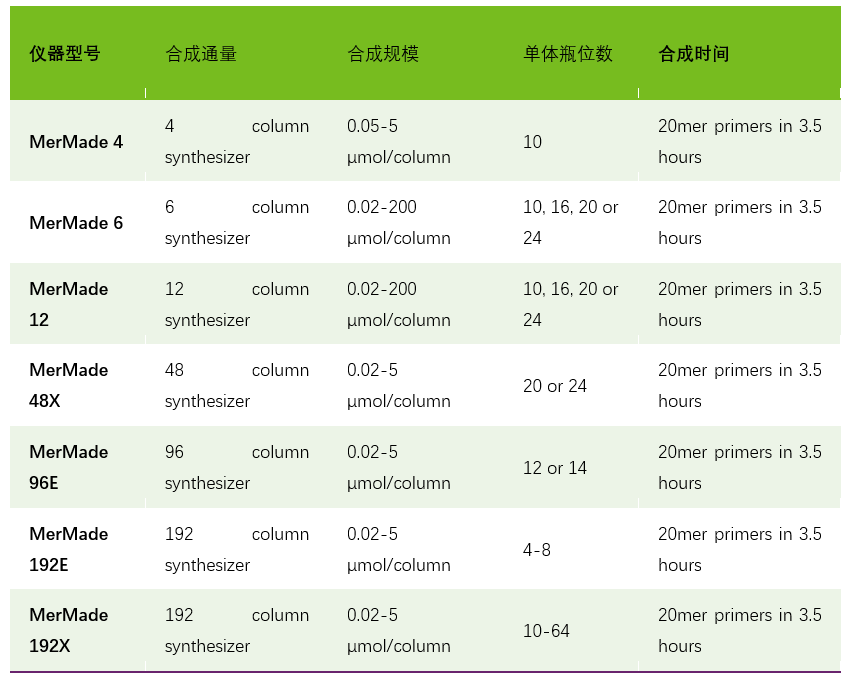 此外,我们还提供4柱、48柱、192柱合成仪,以及一站式核酸合成试剂耗材,满足不同合成规模,通量和种类需求,详细见下表: