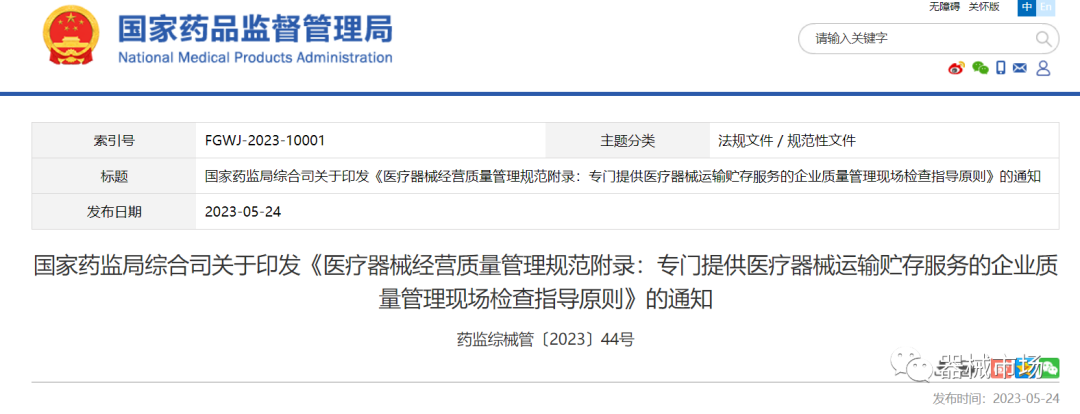 2023年5月24日,国家药监局发布了医疗器械经营质量管理规范附录:专门提供医疗器械运输贮存服务的企业质量管理现场检查指导原则》。进一步贯彻落实《医疗器械监督管理条例》,推动《医疗器械经营监督管理办法》《医疗器械经营质量管理规范》有效实施,保证医疗器械在运输、贮存环节的质量安全。