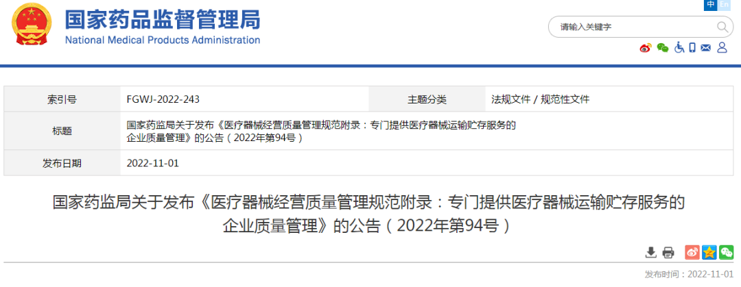2022年11月1日,国家药监局发布了《医疗器械经营质量管理规范附录:专门提供医疗器械运输贮存服务的企业质量管理》的公告。