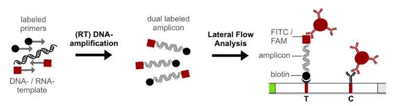 核酸层析试纸的检测原理多以夹心法为基础,首先使用两种小分子标签:硫氰酸荧光素(FITC)和生物素(Biotin)分别标记上下游扩增引物,核酸模板通过不同方式(如PCR、LAMP、RPA等)扩增后,在扩增产物中同时引入了FITC与Biotin,在核酸层析试纸的结合垫中包被有抗FITC抗体修饰的胶体金或乳胶微球,因此扩增产物加入时会与胶体金或乳胶微球结合往T线流动;T线处包被有能与biotin快速高效结合得链霉亲和素(SA),因此胶体金或乳胶微球可以在T线处被固定下来显现出明显的色带,呈现阳性结果。同理阴性样本因无扩增产物,胶体金或乳胶微球不会被固定在T线位置而不显色。试纸C线处包被有能与抗FITC抗体结合的二抗,可以结合流动中的胶体金或乳胶微球从而判断层析是否正常。