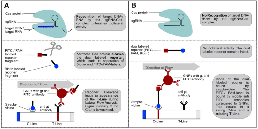 CRISPR系统作为细菌获得性免疫的重要组成部分,在分子诊断领域带给大家的是无限想象空间。通过合理的CRISPR探针与试纸设计,CRISPR-Cas层析系统能够判读出探针的被剪切状态,从而判断样本中是否存在待检测的靶标。一般的设计原理是:报告探针是一种携带末端标签Biotin与FITC的短的单链DNA或RNA分子,在待检测靶标存在情况下,CRISPR-Cas的反式切割活性被激活,进而将探针剪切,导至终端标签Biotin与FITC的分离;CRISPR-Cas层析试纸与上述核酸试纸类似,在结合垫均包被了抗FITC抗体标记的胶体金或乳胶微球,不同的是,C线位于T线之前,C线中包被了可与Biotin结合的SA;当样本中靶标不存在时,探针上Biotin与FITC的标签完整,胶体金或乳胶微球会被全部固定在C线上,从而T线不显色;当样本中靶标存在时,探针上Biotin与FITC因Cas酶激活的反式切割活性而分离,部分胶体金或乳胶微球上因没有Biotin标签因此不会被C线截留,从而可以继续往T线处流动,在T线处包被有可与抗FITC抗体结合的二抗,在此处胶体金或乳胶微球被固定呈现出色带,表示阳性结果。