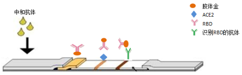 新冠中和抗体是一种可特异性阻断新冠RBD蛋白与人血管紧张素转换酶2(ACE2)结合的中和性抗体,在人体对新冠病毒体液免疫机制中起着至关重要的作用,也是疫苗开发与效价评估的重要指标。基于竞争法免疫层析的原理,在层析试纸上也可实现对新冠中和抗体的便捷定性检测。首先将RBD抗原修饰在胶体金或乳胶微球上固定于结合垫中,将ACE2抗原固定在NC膜的T线位置,能与胶体金或乳胶微球标记的RBD特异结合的抗体固定在NC膜的C线位置。当样品中含有新冠中和抗体时,中和抗体会与RBD结合,进而减少了RBD修饰胶体金或乳胶微球与T线处ACE2的结合,T线色度显著下降,从而可定性识别出样本中是否含有中和抗体。