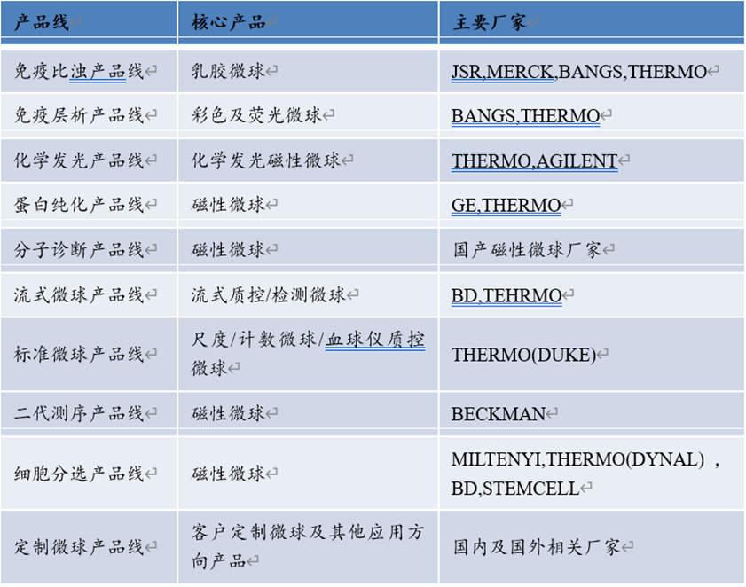来源:智银医药和各公司官网 国内IVD微球市场约17亿,进口品牌绝对主导 2015-2019年我国IVD试剂行业市场规模不断增加中国医疗器械蓝皮书统计数据显示,2018年我国IVD试剂市场规模为604亿元,初步估算,2019年我国IVD试剂市场规模为678亿元。 上游核心原料约占整体市场的10%,其中微球、NC膜等载体系统约占核心原料的25%,那么2019年国内微球等载体系统的市场空间约为17亿元。 全球的IVD市场规模约为714亿美金,按照中国的核心原料占比测算,2019年全球IVD微球的市场空间约为17.85亿美金,折合人民币约为125亿元。 目前国内的IVD领域使用的微球主要以进口产品为主,国产品牌占整体市场不到10%,受制于人的现象非常明显。 从供给端来看,目前国内的微球生产企业多数规模较小,产品质量参差不齐、品牌影响力无法与国际品牌相提并论;从需求端来看,研发型客户主要需求特征是量小质量要求高、产业化客户主要需求特征是有替换动力,但替换周期长。 · 对于研发型企业进口品牌是第一选择,主要原因包括早期微球使用量比较小,药监部门的严格审核,对国产品牌信心不足以及未来销售预期不明确等等。 · 产业化客户由于产品销售体量大,对于微球的替换动力会相对较强。但是对于IVD产品,影响产品终端检测性能的是整个体系,而非某一单一核心原料,微球的替换可能会带来抗体、Buffer等整个体系调整,因此客户在进行微球替换的时候会比较谨慎,考察周期通常较长。 微球在IVD领域具有极为广泛的应用场景 核酸提取主要使用的微球种类包括硅羟基磁珠和oligo磁珠。带有表面基团的磁珠能与检测样本中释放的核酸进行特异性可逆结合。同时利用磁珠自身具备的磁响应能力,在外加磁场的作用下进行定向移动与富集,从而实现对核酸的分离纯化。 磁珠法核酸提取主要的优点包括操作简单自动化、可大批量操作、用时短。 化学发光主要使用的微球种类为羧基磁珠。磁珠法化学发光免疫分析是将磁性分离技术、化学发光技术、免疫分析技术三者相结合的一种分析方法,充分利用了磁性分离技术的快速易自动化优势,化学发光技术的高灵敏度及免疫分析的特异性,是目前IVD市场的璀璨明珠。 根据相关的券商报告数据,2019年中国化学发光市场规模将达到230亿元,未来仍然将以20%以上的行业增速保持较快增长。 侧向免疫层析主要使用的微球种类包括荧光微球和彩色微球。免疫层析主要是基于免疫识别以及抗体标记技术,使待检测物中各组分(抗原、抗体、蛋白质等)通过毛细管作用力的移动速度差异,在反应基质上实现分离的色谱系统。 荧光免疫侧向层析凭借高灵敏度及稳定性,广泛应用于各类指标的POCT检测。 乳胶增强比浊主要使用的微球种类为乳胶微球。胶乳增强比浊技术和普通免疫比浊技术一样,都是通过在反应体系中检测抗原抗体形成的免疫复合物来分析样品中待测物的浓度。 普通免疫比浊技术,由于样品中的抗原其与抗体交联的能力有限,形成的免疫复合物的数量、大小也有限,导至检测敏感性差,检测范围不够宽。 胶乳增强技术是将抗体连接在微小的胶乳颗粒上,当抗原抗体结合形成抗原-抗体-胶乳颗粒复合物,增加了免疫复合物的直径,提高了检测敏感性,也减少了受到其他非特异性反应的影响。 磁珠是高通量测序过程必备产品,通过磁颗粒活性基团在一定条件下可与核酸结合和解离的原理,将样本中目的片段分离。可实现对核酸样本的高通量自动化操作,广泛应用于基因测序以及分子诊断领域。 一种基于两个纳米微球利用单线氧能量的短距离扩散,激发已形成的相邻位点的化学发光反应来测定生物分子的检测技术。 每个发光测定包含两种微球类型:供氧微球和受氧微球,两种微球的表面都修饰了多糖水凝胶,使其非特异性结合和自聚集降低到最小化,并带有大量的活性基团便于和生物分子进行化学偶联。 均相化学发光技术凭借着免清洗、高灵敏度、宽动态监测范围等技术优势,将成为化学发光的发展趋势之一。 液相芯片是基于编码微球和流式技术的一种临床应用型高通量发光检测技术,属于新型生物芯片技术平台,是由微球、探针分子、待测分子、信号系统四部分组成。 在不同荧光编码的微球上进行抗原抗体、酶底物、配体受体的结合反应及核酸杂交反应,通过红、绿两束激光分别检测微球编码和报告荧光来达到定性和定量的目的。 在多联检检测具有独特优势,主要应用肿标、自身疾病、HPV分型等指标的检测。 单细胞测序的关键是单细胞的分离和纯化,目前最常见的分离方法可用MACS磁珠或流式细胞仪进行目的细胞分选和富集。 相较流式细胞的分选方法,MACS磁珠法不受到高压、电荷、减压与剪切力刺激,作用温和不影响细胞的生物功能的完整性,可最大程度保持细胞活性和功能。 即数字ELISA,通过免疫标记的方法,利用抗体捕获和识别抗原,进行信号分子标记或是酶联标记的形式,通过单分子荧光信号检测或单分子酶促反应实现的单分子级别蛋白分子的检测,其检测灵敏度达到fg级别,远超现有的化学发光技术,在新型标志物的发现、微量标本的检测以及神经系统血液检测等领域具有独特优势。 单分子检测体系对所使用磁珠的粒径大小以及均一度有较高的要求。 主要包括标准计数微球和标准尺度微球,主要用于精密仪器的验证和校准,以保证仪器的正