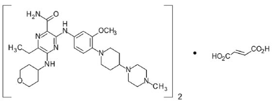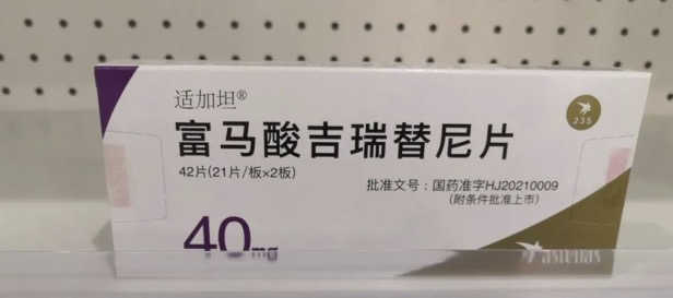 2021年,安斯泰来的新药适加坦®(富马酸吉瑞替尼片)(Xospata,gilteritinib)被中国国家药品监督管理局(NMPA)批准用于治疗FLT3突变阳性的复发或难治性急性髓系白血病(AML)(附条件批准)。吉瑞替尼于2020年7月获得中国国家药品监督管理局的优先审评资格,并在2020年11月被列入第三批临床急需境外新药名单;从本品在中国提交新药上市申请(NDA)到获批不足10个月。