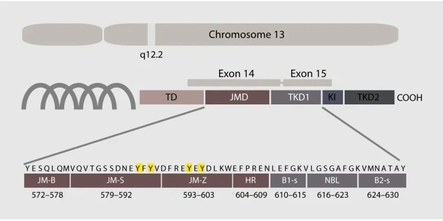正常情况下,受体酪氨酸激酶的近膜区(JM)和结构域(TKD)具有自我抑制功能,使激酶处于一种非活性构象。而当JM区发生插入突变(ITD)或结构域活性回路出现替代突变时,导至组成性FLT3激活,可以使得受体膜旁自身抑制结构域功能失控,从而导至配体非依赖性的信号通路的活化和配体的高度反应性。这种突变的受体主要在髓系祖细胞表面表达,下游的PI3K-AKT/RAS-MAPK/STAT5信号通路异常活化可以使得MCL-1 (抗凋亡蛋白家族成员)过表达和髓系分化。研究表明FLT3单突变不足以导至白血病细胞的转化,突变往往发生白血病转化的晚期,联合其他基因异常导至细胞的恶性增殖和克隆。