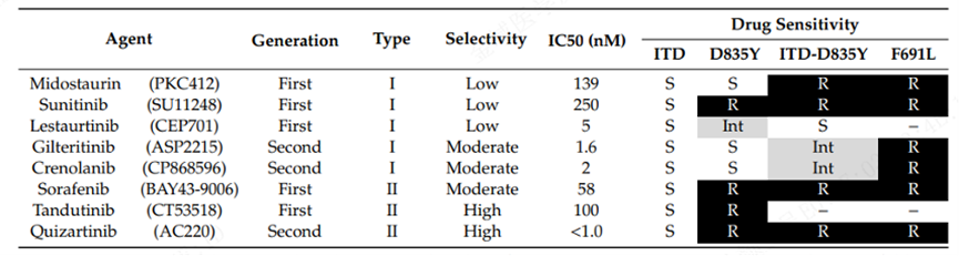 FLT3-TKD 点突变在AML 中约占7-10%,突变预后意义不明;突变主要与FLT3 抑制剂治疗抵抗相关,如下表FLT3 p.F691L 突变对目前的FLT3 抑制剂具有普遍耐药性。