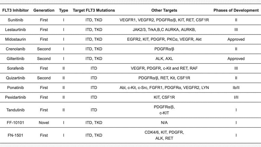 FLT3 突变的患者推荐使用FLT3 抑制剂进行靶向治疗。根据药物与FLT3 受体结合和作用方式可以分为I 型和II 型抑制剂。I型靶向抑制剂可以与活化型和非活化型受体结合,对于FLT3-ITD 和TKD 突变均有效,如 Lestaurtinib、Sunitinib、Midostaurin、Crenolanib、Gilteritinib;但是II 型抑制剂与紧邻ATP结合位点的疏水区相互作用,该疏水区只有当受体处于非活性构象(ITD)时才可接近,因此II 型靶向抑制剂仅仅对ITD 突变患者有效,如Sorafenib、Quizartinib、Ponatinib。根据靶向药物是否可以特异性结合FLT3 受体可以分为一代靶向抑制剂和二代靶向抑制剂。一代靶向抑制剂可以非特异性结合除FLT3 以外的其他激酶受体,如c-KIT、PDGFR、VEGFR等,因此副作用会较强,更容易出现脱靶效应,如Lestaurtinib、Sunitinib、Midostaurin、Sorafenib。二代靶向抑制剂可以更加特异的结合FLT3 受体,脱靶效应较少,疗效更佳,如Crenolanib、Gilteritinib、Quizartinib。