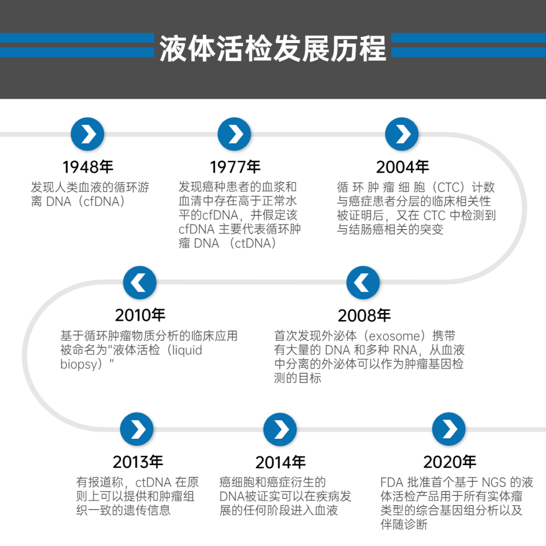 液体活检是指,在体液样本中提取分子标志物进行检测分析,为患者的疾病诊疗提供决策信息。实际上,从肿瘤取样角度、相对组织活检而言,液体活检是一类技术术语,且正在不断演化及发展,并无确切定义。■ 发展历程