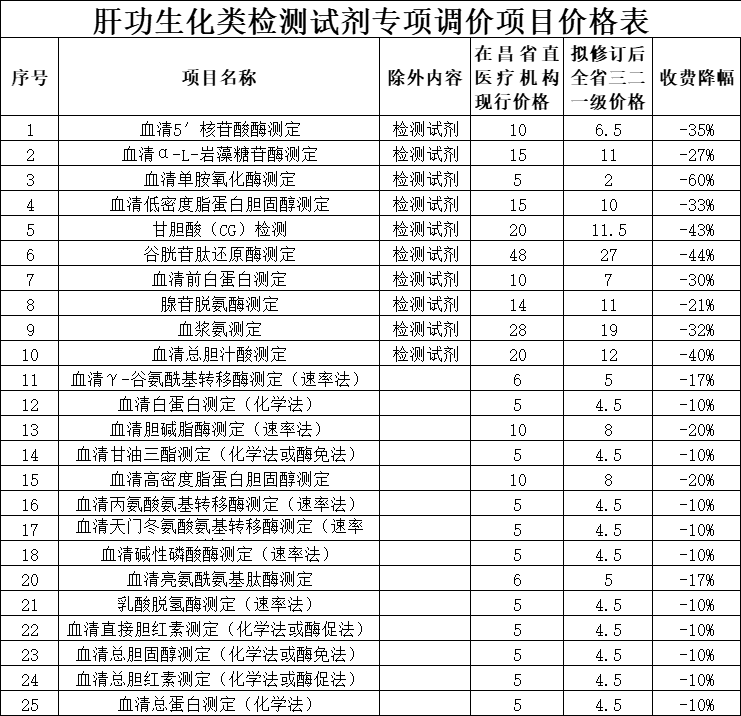 此次价格调整,降幅最高的40%(含检测试剂),最低的10%,其中,技耗分离收费的10个产品,降价幅度较大: