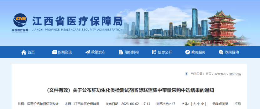 2023年6月2日,江西医保局发布《关于公布肝功生化类检测试剂省际联盟集中带量采购中选结果的通知》,公布了肝功生化类检测试剂省际联盟集中带量采购中选结果及肝功生化类检测试剂省际联盟集中带量采购中选供应清单