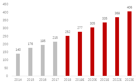 来源:弗若斯特沙利文、高禾投资研究中心 2. 中国辅助生殖市场规模由于生育率上升、人口老龄化加剧和政府激励政策(如二胎政策),辅助生殖市场需求逐步增加,但我国辅助生殖渗透率较低。根据弗若斯特沙利文数据显示,2014-2018年中国辅助生殖市场规模从140亿元增长到252亿元,CAGR为13.6%。业内人士指出,生育障碍性疾病患病率攀升导至市场对辅助生殖服务的需求不断扩大。未来,在资本的助推下,辅助生殖服务行业发展前景将十分广阔,辅助生殖领域也将进入跑马圈地期,市场规模将进一步扩大。根据高禾投资研究中心预测,2023年中国市场规模预计达到406亿元人民币。 图 2014-2023E中国辅助生殖市场规模(亿元人民币)