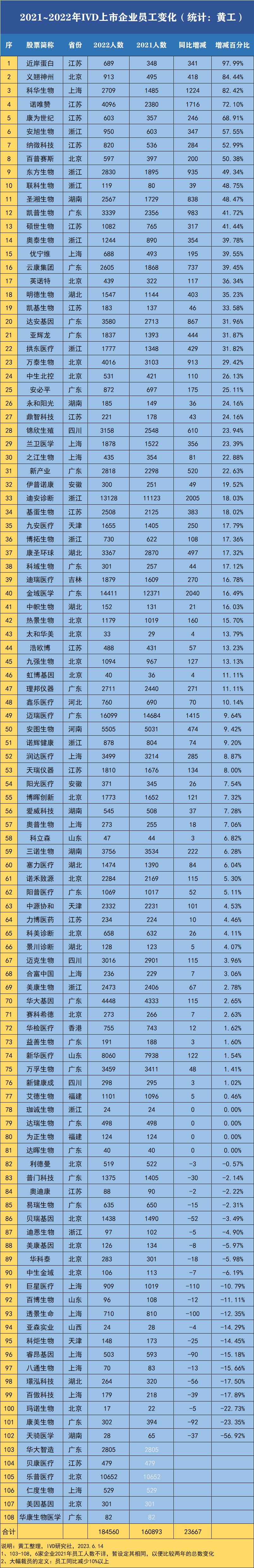 最近看到多个自媒体,纷纷转发IVD大裁员的文章。仔细阅读其中内容,发现基本都是国外企业宣布裁员的新闻。少则几十人,多则几百人。但都是一些中小企业。IVD四巨头:罗雅丹西等,似乎没有这方面的新闻(指诊断业务条线裁员)。 裁员,是经济性裁员的简称。是因用人单位的原因解除劳动合同的情形。该词指的是用人单位在法定的特定期间依法进行的集中辞退员工的行为。对阶段性用工需求量较大的企业与生产不饱和、富余员工较多的企业开展共享用工。通俗讲,企业裁员要赔偿几个月工资。裁员与员工正常流动(主动辞职),这个如何区分定义呢?据公开资料,的确难以判定。除非企业主动宣布。由于IVD行业人员,一年内的流动性没有那么大,本文将企业员工总数同比减少5%及以上,定义为有裁员现象或行为。下表统计了100多家,IVD行业相关上市或挂牌企业,这两年员工人数的变化情况。从表中能看到,符合裁员定义的,即员工人数同比减少5%及以上的企业,只有15 家,占总企业的15%不到。而且是以新三板的中小企业(不超过300人)为主。 当然,有一个因素值得注意。这是2022年的情况。2022年还有疫情,业务在持续增长,只不过增速放缓而已。直到年底新政策出台,才导至行业发展阶段性拐点出现。这些政策和外部环境因素,传递到企业,再由企业做出人事调整安排,其实就到了2023年。这些员工数据变动,不会出现在2022年财报当中。说白了,下表能反映的情况是,2022年超过8成的IVD企业,都在扩张团队,研发、生产、销售、服务等职能口。但是!今年开年后,和许多HR、猎头以及企业内部人员交流,有部分说到公司在裁员了,招聘进度也放缓了。但都没有形成公开的新闻。从市值、营业收入、净利润等角度看,绝大多数IVD企业同比都呈下降趋势,这是大环境直接决定的。有一些业务在收缩,有一些业务在扩张,团队一减一增,从财报员工规模数据,难以看出来。 1、部分不挣钱的业务条线团队,因业务收缩而被裁撤。2、部分企业在布局新的业务线和技术平台,也在扩张团队招新人。3、行业整体收缩是肯定的。至于“寒冬是否已至”这一观点,还需要更多数据、更多角度来论证。 4、2023年是后疫情时代开局之年,今年发展很关键。但数据如何,至少得8月份半年报发布后,才更好证实一些观点。下表怎么看,各位朋友见仁见智了。 作者:黄工,IVD研究社创始人、主编,致力于IVD产业观察和研究。主编《中国IVD企业地图集》《中国IVD研发蓝皮书》。运营两个知识星球:黄工IVD圈子、IVD仪器研究社,以及30+行业微信群。个人微信:hhm6867,添加请备注:公司-姓名-职务。