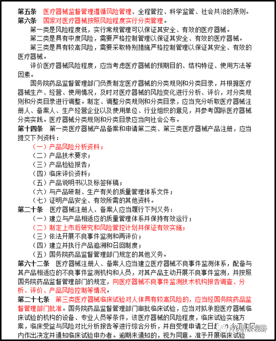 2.法规要求提到风险的医疗器械管理文件非常多,越是下层与风险密切相关的文件,风险要求越具体,如《医疗器械不良事件监测和再评价管理办法》,出现风险达51次。以下仅摘录《医疗器械监督管理条例》、《医疗器械生产监督管理办法》中提到的风险条款。2.1《医疗器械监督管理条例》提到风险共21处,主要在以下方面需要考虑风险,应用风险管理进行监管。 ③医疗器械注册或备案人应制定和实施上市后的风险管控计划,报告不良事件产品风险控制情况:④第三类医疗器械中临床高风险产品的临床试验需要审批: