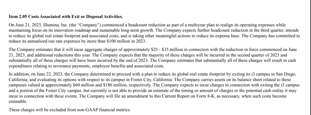 Illumina近日提交至美国证券交易委员会的8-K表中披露了以上计划,但没有明确指出裁员的数量。根据内部消息,Illumina首席技术官Alex Aravanis指出,本次裁员或将波及10%的研发部门的人员;公司技术开发副总裁Steve Barnard则在一份说明中表示,公司正计划关闭在福斯特城的所有实验室工作。Illumina表示,裁员是公司一项长期计划的其中一部分,目的在于降低公司的运营费用,同时保证创新和可持续增长。据悉,这项长期计划在今年4月推出。当时,Illumina发布一季度财报,显示营收同比下降11%。公司同期推出了这项削减开支的报告,计划在未来数年内削减1亿美元以上的年度开支,以提高利润率。据悉,上周的裁员只是本次裁员潮中的第一轮,公司临时首席执行官 Charles Dadswell在另一消息渠道中表示,“这不是最后一次裁员”。目前,Illumina计划在第三季度进一步裁员,并减少其全球房地产的分布及相关成本。同时,Illumina正采取其他行动来减少其基础开支。Illumina估计,此次裁员潮以及今年额外的裁员将产生总计约2500-3500万美元的费用支出,包括遣散费、员工福利及其他相关费用等。公司表示,这些支出大部分将在今年二季度发生,并在2023年底前基本完成支付。本次裁员是Illumina继2022年底的一轮裁员后的大规模裁员,在2022年底的裁员事件中,Illumina优化了约500名员工,占公司当时全球员工总数的5%。 除裁员外,Illumina在本次递交的表格中也披露了其退出圣地亚哥i3卫星园的计划。此外,公司还在评估旧金山湾区福斯特市的业务。Illumina没有披露以上计划可能产生的费用金额,但在文件中表示:“公司持有与这些园区相关的资产,价值分别约为6000万美元和1.86亿美元。同时,近期离任的首席执行官Francis deSouza目前也在湾区的办公室工作。” 这则裁员消息发布之际,Illumina正处于“动荡时期”。由于对Grail的收购以及卡尔·伊坎等人的“挑战”,上月,Illumina董事长被更换;数周前,时任CEO主动提出辞职。此前,卡尔·伊坎在公司发布削减开支计划时曾发出批评,表示公司因收购及运营Grail已“耗尽”核心业务。据透露, 目前Grail也在持续裁员。“许多员工会经历岗位调动,也有部分员工会被解雇。”Grail的一位发言人表示,公司目前已经重组了资源,专注于最大的商业机会,尤其是与卫生系统方面的合作。
