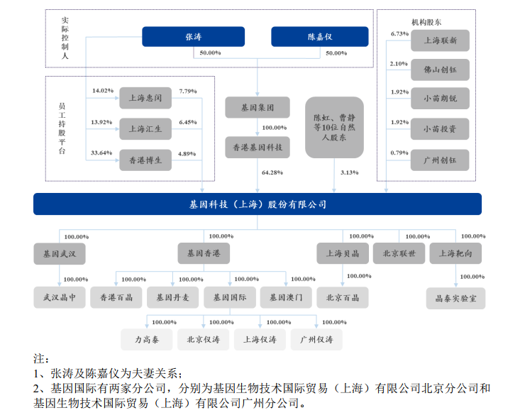基因科技(上海)股份有限公司是一家面向高等院校、科研机构、医院和生物医药企业,提供生命科学科研仪器、试剂和体外诊断仪器、试剂以及技术服务的综合服务商。公司成立于2004年,法定代表人张涛,注册资本8459.5166万元,位于上海市闵行区。公司前身基因科技有限由香港基因科技100%出资,2016年变更设立为股份有限公司。公司实际控制人为张涛和陈嘉仪(夫妻关系),二人持有基因集团100%股份,基因集团持有香港基因科技100%股份,通过香港基因科技、上海惠闵 、上海汇生 、香港博生间接控制公司合计 83.41%的股份,为公司实际控制人 。