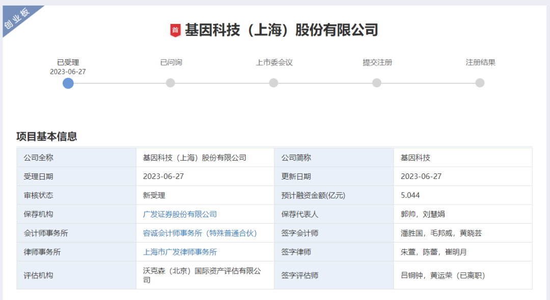6月27日,基因科技(上海)股份有限公司(简称基因科技)向深交所创业板递交了IPO招股书,保荐机构为广发证券,拟募资5.044亿元,用于上海研发生产基地建设项目、基因科技(武汉)生物医学设备及试剂研发生产项目、生物技术演示推广中心项目以及补充流动资金项目。