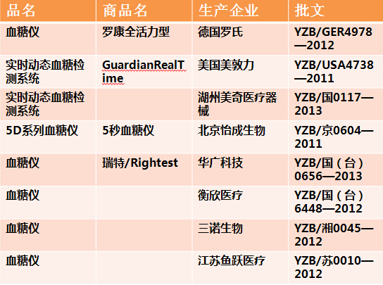 表1:部分血糖仪批文情况 在我国血糖仪市场中,目前仅中国境内销售的产品就有超过30家不同品牌,其中三诺、怡成等都是国内厂商中的知名品牌,鱼跃医疗也凭借高性价比和渠道优势在市场中逐渐占据一席之地。三诺生物2014年中报显示,公司上半年血糖监测系统实现销售收入2.49亿元,同比增长17.8%;鱼跃医疗2013年半年报显示,血糖检测系统2013年上半年贡献收入3000万元,环比2012年下半年翻番增长。从国内主要血糖仪生产企业销售情况来看,我国血糖仪市场增长速度较快。然而,在市场高速发展的形势下,该行业却存在着血糖仪几乎成本定价,盈利需要靠试纸的现象。以三诺生物为例,该公司2013年报显示,报告期内实现主营业务收入4.48亿元,其中血糖测试仪收入为9710.13万元,血糖检测试纸收入3.5亿元;平均销售毛利率65%左右,而这主要来源于试纸。然而,随着血糖监测技术不断提高,动态血糖监测系统生产厂家逐步增加并获得患者认同,血糖仪以试纸盈利的时代会否终结,动态血糖监测系统能否成为主流产品,我们拭目以待。