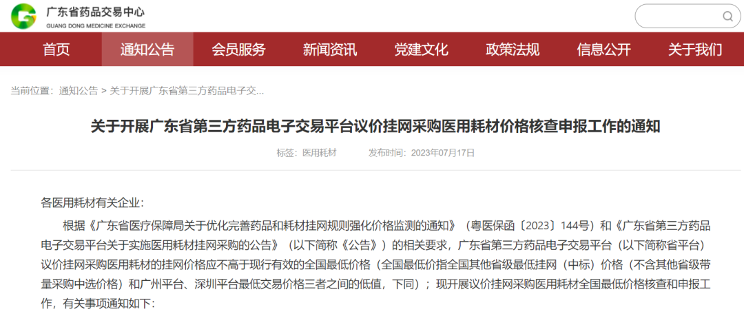 2023年7月17日,广东省药品交易中心发布文件,关于开展广东省第三方药品电子交易平台议价挂网采购医用耗材价格核查申报工作的通知,开展议价挂网采购医用耗材全国最低价格核查和申报工作。 这是自河北7月12日发布最低价联动文件以来,又一个省份开始核查和申报挂网产品最低价联动。