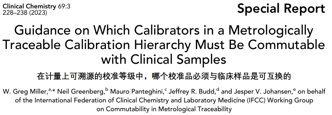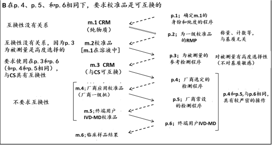 在计量上可溯源的校准等级中 哪个校准品必须与临床样品是可互换的 使用不同终端用户的体外诊断设施(IVD-MD)检测临床样品中相同被测量具有等同结果,是为诊断、治疗、监视、或风险评估是必须的。ISO 17511:2020规定了如何建立计量溯源性到较高等级可用的参考系统成分,使得在IVD-MD间有等同的结果。与临床样品(CS)互换性是参考物质在校准等级中作为一个校准品的必须特性。但是,在校准等级中不是所有校准品被要求是可互换的;不同校准等级对哪个校准品必须与CS具有可互换具有不同的要求。因为互换性的评估是一个艰巨的努力,所以,重要的是,在实施某个校准等级时,确定哪些校准品需要可互换的。我们提供了一个指导,在纠正任何不可互换的偏移是适当下,哪些校准品必须与CS是可互换的;以及在ISO 17511:2020中,叙述的各个类型校准等级中,没有要求校准品与CS的互换性。 背景 使用不同终端用户的体外诊断设施(IVD-MD)检测临床样品中相同被测量具有等同结果,是为诊断、治疗、监视、或风险评估是必须的。ISO 17511:2020规定了如何建立计量溯源性到较高等级可用的参考系统成分,使得在IVD-MD间有等同的结果(1)。计量溯源性是通过系列校准步骤的一个不间断链,从可用的最高参考物质(RM)和/或参考检测程序(RMP),到临床样品(CS)的最后结果。一个IVD-MD的最合适的计量溯源性是SI制单位,其中计量溯源性被校准等级确定,开始于较高等级RN或RMP,依从了各自ISO 15194(2)或15193(3)标准。 计量溯源性到较高等级的参考系统组分。使得在不同时间和地点,和不同终端用户IVD-MD间得到一致的校准等级。ISO 17511:2020叙述了校准等级的示例,说明溯源性到SI和较高等级的参考系统组分是可能的,其他情况仅为可用的技术方式,是校准等级没有包括较高等级RM和/或检测程序(MP),作为厂商选定的指定RM(1)。 ISO 17511:2020在多个地方提示了RM互换性和校准品可应用在给定校准等级处的重要性。但是,没有提供明确的指导,在一个等级内的特定校准品,必须与CS是可互换的,或互换性不是必须的。一个校准品未被检出的不可互换性,会引起某个MP具有偏移。因为评估互换性是一个很艰巨的努力,很重要的是确定,在实施IVD-MD的校准等级中,哪个校准品需要与CS是可互换的。 国际计量学词汇定义参考物质的互换性:对于给定物质的规定量,由两个给定测量程序(MP)得到的测量结果间关系,与其他指定物质测量结果间关系一致程度表示的参考物质(RM)的特性(4)。在检验医学,“其他指定物质”是临床样品(CS)。互换性可以定义为:更有功能的叙述,为某个RM的特性,以两个或更多的检测系统检测,对RM的检测响应,与含有相同规定被测量的量临床样品是相同的。 在合适相应下,某个RM的互换性可以按照文献的技术叙述予以评估(5-7)。一个溶液的基质包括所有除了分析物外的所有分子和离子。在校准物质的基质,与CS的基质有足够差异下,将偏移引入某个MP的校准等级,引起了不可互换性。在相应环境下,不可互换性的偏移可以在添加某个纠正步骤到校准等级中去除(8)。 本报告中,在ISO 17511:2020中叙述的一些校准等级通用模式中,我们提供了指导,就某个校准等级中哪些校准品,必须与CS是可互换的,何时对不可互换性的偏移的纠正是合适的,何时一个校准品的互换性不是要求的。因为在ISO 17511:2020展现的校准等级模式,会应用在被不同IVD厂商各个不同配置到适应可用的RM和MP,这里给出的示例,代表了特定的实施,去展现逻辑被应用去确定,是否在某个特定校准等级中对校准品要求互换性。展现的概念也可被应用到需要的校准等级的各个其他需要的基质等级的配置。 在要求和不要求校准品的换性的指导和示例 在图1、2和3中,展现的校准等级中的每个步骤,按照ISO 17511:2020确定的习俗标记缩略号。这些缩略号确定了检测程序的标准等级水平(指定为p.1到p.6),和校准物质(设定为m.1到m.6)在确定的校准等级内每个在水平处展开。对每一个这些标准词语以及详细解释,在计量上可溯源的校准等级内在ISO 17511:2020内给出相应缩略号,并总结在表1中。 一个 “完整”计量溯源性到SI,如在ISO 17511:2020,5.2内叙述的,被展现在图1A。被广泛接受的做法是,使用一组真实CS(m.3),将一个p.3 RMP的值转换到m.4和/或p.6终端用户IVD-MD,对于m.3 RM去用于临床实验室为CS(m.6)确定值。按照定义一组真实CS被接受为可互换的,以及被选定的CS组在制备和储存中没有变化,该组没有包括具有干扰物质或其他标本-特定的已知影响的CS,会不利地影响p.4 MP的性能,其中该组CS被用于进行校准(5)。作为p.5常设MP的校准品的功能,m.4厂商的应用校准品(一级批校准品),通常由IVD-MD厂商制备,应是稳定和可用许多年,去支持未来正在序列批的m.5终端用户IVD-MD校准品设定值(该校准品一年内有多批)。使用m.4应用校准品,替代了m.3一组CS。去校准p.5常设MP,为此节省了连续的、设定值、和保持CS组等的费用。 若可能,可要求替代一个有证参考物质(CRM),它与该组CS处于m.3位置的是可互换的,使得IVD-MD厂商在实施计量溯源性较早,并较少的费用。同于m.3位置的CRM,为二级CRM,有别于在m.1位置的一级(纯物质)CRM。二级m.3 CRM经常具有的基质类似于CS,促使与未改变的CS具有互换性。为该被测量的可互换的m.3 CRM,由国家计量研究院产生,预期被用于所有IVD厂商,作为它们各自的内部基质等级,去实现为CS在许