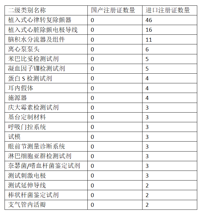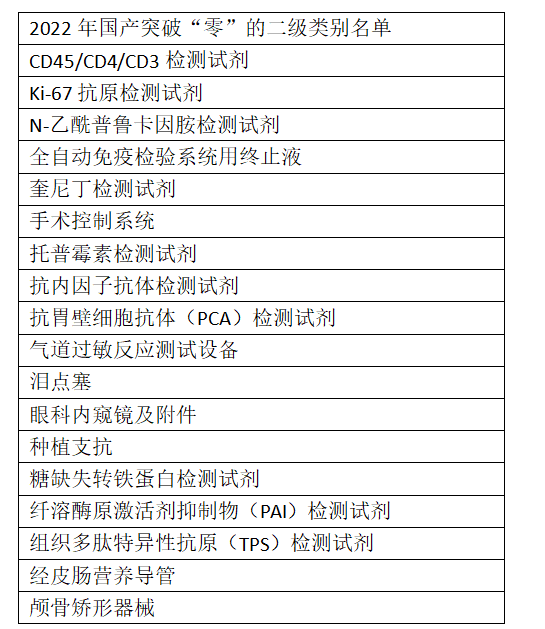 2022年我国医疗器械主营业收入已经达到1.3万亿元,中国医疗器械产业近5年年均复合增长率达10.54%。在庞大的医疗器械市场中,国产高端器械仍处于爬坡期,同时也将成为未来市场发育的重要动能。7月14日,国家发改委发布《关于<产业结构调整指导目录(2023年本,征求意见稿)>公开征求意见的公告》(以下简称《目录(2023年本)》征求意见稿)。《目录(2023年本)》征求意见稿由鼓励、限制和淘汰三类目录组成。具体包括:新型基因、蛋白和细胞诊断设备,新型医用诊断设备和试剂,高性能医学影像设备,体外膜肺氧合机等急危重症生命支持设备,人工智能辅助医疗设备,移动与远程诊疗设备,腔镜手术机器人等高端外科设备,高端康复辅助器具,脑起搏器、全降解血管支架等高端植入介入产品,生物医用材料、增材制造技术开发与应用、智能医疗,医疗影像辅助诊断系统、医疗机器人、可穿戴设备新建、改扩建充汞式玻璃体温计、血压计生产装置、银汞齐齿科材料,新建2亿支/年以下一次性注射器、输血器、输液器生产装置充汞式玻璃体温计、血压计生产装置(2025年12月31日)在国家层面的文件中,高端医疗器械的创新发展已被多次强调。此前,《“十四五”医疗装备产业发展规划》中提出,到2025年,技术水平不断提升。医疗装备在预防、诊断、治疗、康复、健康促进、公共卫生等领域实现规模化应用。体外膜肺氧合机(ECMO)、腔镜手术机器人、7T人体全身磁共振成像系统、质子重离子一体治疗系统等一批高端产品实现应用。重点发展诊断检验装备、治疗装备、监护与生命支持装备、中医诊疗装备、妇幼健康装备、保健康复装备、有源植介入器械7大器械领域。以腹腔手术机器人为例,自2021年以来已有威高的妙手S、微创机器人的图迈、苏州康多的康多机器人、精锋的MP 1000以及术锐的单孔手术机器人等多款产品获批。ECMO领域,今年1-2月,来自汉诺医疗、航天新长征和江苏赛腾医疗的三款国产ECMO产品获批上市。此外,汉诺医疗的一次性使用离心泵泵头和一次性使用膜式氧合器于7月5日通过国家药监局应急审批程序获批上市。对于国内企业而言,在诸多医疗器械细分赛道,突破技术壁垒、推出一流的高端器械,仍有许多难点。不过整体来看,「国产零突破」已经在不少领域实现。据众成数科数据,截至2022年底,在《医疗器械分类目录》中的1765个二级产品类别下,我国有74项二级类别的产品仅有进口产品注册证,尚未有国产产品获批。与此同时,2018年-2022年,我国产品注册的国产化进程保持稳步推进。2018至2022年我国国产注册证数量为零的二级类别产品数量 (资料来源:国家药监局 众成数科整理)从具体领域来看,共有18个二级类别的产品在2022年获得了「国产零突破」。尚未零突破的产品主要集中在有源植入和体外诊断领域,其中植入式心律转复除颤器仍是注册证最大的短板,共有46款进口注册证获批,无国产注册证获批。截至2022年我国国产注册证数量为零的二级类别产品名单国家层面,对于创新高端器械、“卡脖子”医疗器械的政策扶持不断。 前不久,国新办举行“权威部门话开局”系列主题新闻发布会。国家药监局副局长徐景和谈到,近年来,国家药监局加强监管科学研究,不断创新审查举措。启动实施中国药品监管科学行动计划,围绕技术和监管前沿持续研发医疗器械监管新工具、新标准、新方法。建立技术审评向产品研发阶段前移的工作机制,重点围绕如ECMO、粒子治疗系统、心室辅助系统等高端医疗器械,提前介入指导,加快关键核心技术攻关,以点带面,助推我国高端医疗器械突破。鼓励创新医疗器械上市,推动产业高质量发展。近年来,国家药监局以创新医疗器械为主攻点,先后印发《创新医疗器械特别审查程序》《医疗器械优先审批程序》,让创新产品和临床急需产品“单独排队,一路快跑”。目前已批准国产的“脑起搏器”、碳离子治疗系统、质子治疗系统、磁共振成像系统、全景动态PET/CT、第三代人工心脏、人工血管等217个创新高端医疗器械产品上市,实现了高端医疗器械国产突破,解决了部分产品严重依赖进口的情况,其中多数产品已服务于临床诊疗中,取得了良好的使用效果,提升了我国医学诊疗水平。国家药品监督管理局局长焦红指出,下一步,将继续巩固和固化审评审批制度改革成果。我们针对企业的研发创新进一步加大工作力度。比如,将进一步优化附条件上市申请审评审批相关工作程序,保证药品审评工作能够做到科学严谨、规范高效。同时继续优化临床急需的药品、医疗器械、儿童用药、罕见病用药、国产替代产品、“卡脖子”产品的审批工作,推动审评工作重心前移,完善研审联动的工作机制,进一步加大制定技术指导原则的力度,强化对企业产品研发的指导和服务。根据《“十四五”医疗装备产业发展规划》目标,到2025年,品牌影响力明显提升。医疗装备产品认可度、品牌美誉度及国际影响力快速提升,在全球产业分工和价值链中的地位大幅提高,6-8家企业跻身全球医疗器械行业50强。在国产医疗器械第一梯队中,创新器械的破局已成抢跑关键,国产行业正加速向高端进发。