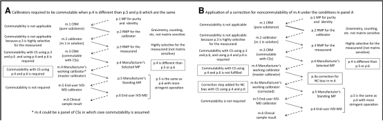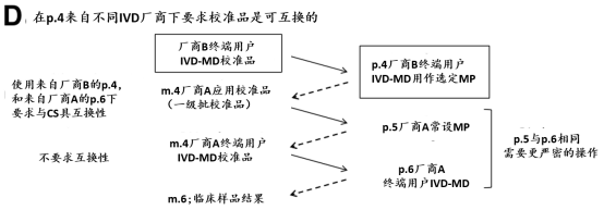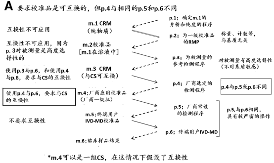 在计量上可溯源的校准等级中 哪个校准品必须与临床样品是可互换的 接上文 图3、(A)组为p.4是与p.5和p.6不同的MP(它们的每一个是相同IVD-MD的示例)下,校准品必须与临床样品是可互换的校准等级。(B)组为没有满足m.4互换性的要求下,将纠正不可互换性偏移的步骤添加到校准等级。步骤p.4a是纠正程序,应用在为m.4定值,去实现m.4a新的定值,再用于校准p.5。(C)组为加注的校准等级,说明校准品必须与临床样品是可互换的,m.3 CRM或CS组是最高等级参考系统的组分。(D)组为加注的校准等级,说明校准品必须与临床样品是可互换的,在p.4选定MP是不同厂商的终端用户IVD-MD,没有其他较高等级参考系统组分可用。(E)组为加注的校准等级,说明校准品必须与临床样品是可互换的,在较高等级纯物质CRM或含有被测量的指定RM,是添加了适当基质形成了m.4应用校准品,没有其他较高等级参考系统组分可用。(F)组为加注的校准等级,说明校准品必须与临床样品是可互换的,而一致性方案是可用的最高等级参考系统组分。所有符号和箭头参见图1。NC为不可互换性。 (注:上面的各个图,我也已经全部放大在下面翻译。冯) 左右滑动,查看更多 在p.4,p.5和p.6均为相同厂商生产的相同IVD-MD的情况 图1B展现了计量溯源性到某个m.1纯物质CRM,在校准等级中的RM必须与CS在MP情况下时可互换的。m.1 CRM是纯物质RM,它与互换性没有关系。为被测量的p.3 RMP的p.3 RMP的m.2 校准品,由m.1 CRM制备。对很好指定(设计)的p.3 RMP应用,经典地不需要与CS的互换性,在m.2的一级校准品基质和m.3 CRM基质二者具有高度的选择性。某个p.3 RMP的性能特性,应不受被检测样品的基质的影响,理想地,应依从ISO 15193的要求(见ISO 17511:2020, ),对者m.2中的被测量是高度选择的(1,3)。 在图1,B中,p.4厂商选定MP、p.5厂商常设MP、和p.6终端用户IVD-MD,是由厂商产生的相同IVD-MD的所有示例。在用于p.4和p.5角色中,IVD-MD典型地以对关键检测系统要素增加了重复检测,如校准品(如,在加到每一个重复检测中的不同瓶数或分样)、CS、和仪器(如,分析仪相同型号台数和/或版本),较按照在p.6终端用户IVD-MD使用说明的要多。使用这些更严密的操作条件,去减少为m.4和m.5校准品定值的检测不确定度。使用相同IVD-MD作为p.4、p.5、和p.6,是IVD-MD厂商的惯例。在这些情况下,在使用p.6的终端用户IVD-MD检测时,要求m,3 CRM与CS可互换,理想地,CRM预期被作为所有厂商IVD-MD的共同校准品。注意,在较早讨论的纠正可能性,若需要,某个特定终端用户IVD-MD,对CRM与CS不可互换的校准等级中,m.3中的不可互换性的偏移需要纠正(8)。 原则上,可互换的m.3 CRM可以用于直接校准所有厂商的p.6终端用户IVD-MD,直接供应m3 CRM给所有终端用户临床实验室,成本太高。而且不实际。因此,IVD-MD厂商典型地制备了m.4应用(一级批)校准品和m.5 终端用户校准品,将可互换的m.3 CRM的值转换给医学实验室检测的m.6 CS结果,只要使用厂商的p.6 终端用户IVD-MD。m.4“一级批”的批量较小,被预期可储存和可用许多年,厂商去校准p.5,被用于为m.5终端用户校准品成功批号定值,通常可以制备较大批量销售给终端用户。依据生产要求,不同批号m.5可以每年制备数批 成为终端用户校准品提供给医学实验室。 m.4和m.5 IVD-MD厂商特定校准品的基质,可以只要适合目的即可,使用IVD-MD厂商的p.6 IVD-MD,将可互换的m.3 CRM(用于所有IVD-MD厂商的共同校准品)的值,转换到m.6 的CS。m.4和m.5校准品没有必须以相同基质制备,也不用于CS具有相同基质,因为它们仅用于特定厂商的IVD-MD。m.4和m.5校准品可以使用纯化化学物,作为初始材料制备(如在缓冲的牛白蛋白溶液或一个水溶液中的分析物)为提供renewable可更新的物质,适合涉及p.4,p.5,和p.6技术的检测。以纯化的化学物制备的m.4和m.5校准品,可产生非常可再现的批间产品,在校准等级的p.4,p.5和p.6位置使用IVD-MD检测,将具有非常一致和可预期的性能。 图2展现了,为什么m.4厂商的应用校准品和m.5 终端用户IVD-MD的校准品,不需要于CS可互换,这是使用的相同IVD-MD作为p.4厂商的选定MP、p.5厂商厂商MP、和p.6终端用户IVD-MD的例子。很重要的要认识,m.4和m,5被预期仅用在为规定的终端用户IVD-MD校准等级;它们没有预期用在任何其他IVD-MD的校准等级。在这些示例中,使用线性校准函数展现和逻辑可推广到非线性连续响应校准函数。在等级中从某个RM值转换到下一个的序列,和为什么一个可互换RM不需要在图2的所有步骤中,叙述如下: 1、 图2A,可互换m.3 CRM(设定值87单位),使用MP p.4具有的检测信号1.560,为p.4建立了线性校准函数,从0到95单位。 2、 图2B,物质m.4,厂商一级批校准品,使用MP p.4的信号1.483。产生的检测信号是由被测量加上与基质有关的不可互换偏移影响。因此,校准函数对m.4设定了值83单位,反映了被测量浓度受到任何不可互换性的偏移影响,具有了受影响的检测信号。任何不可互换性偏移的大小,在为m.4设定值上没有关联,纠正了不可互换性偏移被测量实际值也没有关联。 3、 图2C,物质m.4(设定值83单位),使用MP p.5具有的检测信号1.505,建立了p.5的校准函数。p.5的校准函数的斜率不同于p.4校准函数的斜率,因为这是相同IVD-MDp.4和p.5的不同例子。但是,因为p.4和p.5是相同的IVD-MD,它们受到实际上存在于m.4内任何不可互换性偏移的影响程度是相同的。因此,p.5的校准函数(以m.4校准)正确地反映了从可互换m.3转换到m.4,p.5的线性校准函