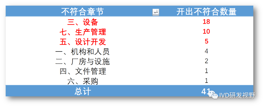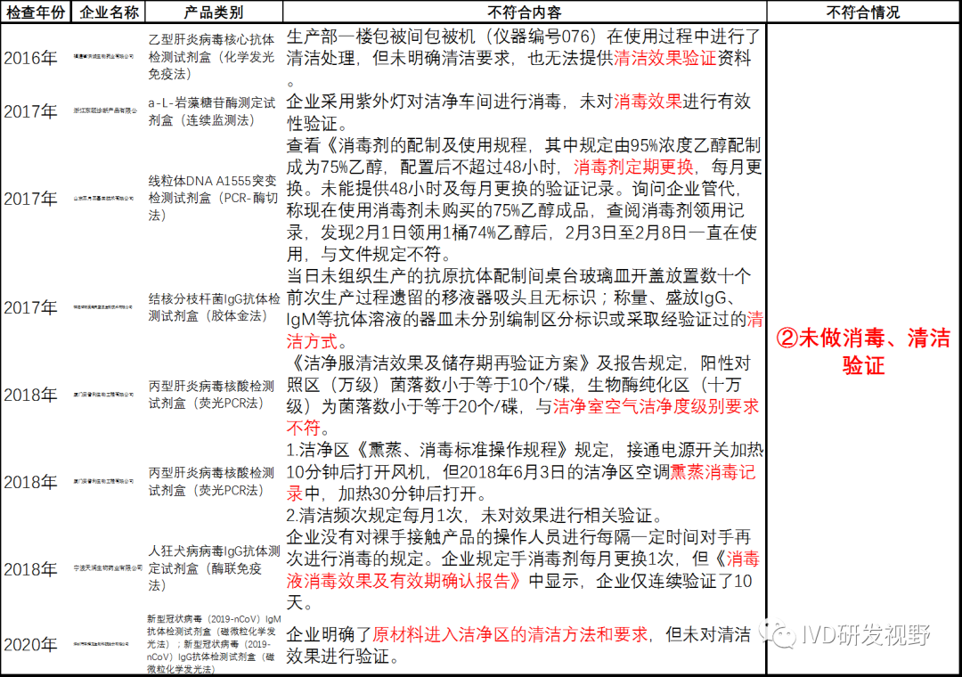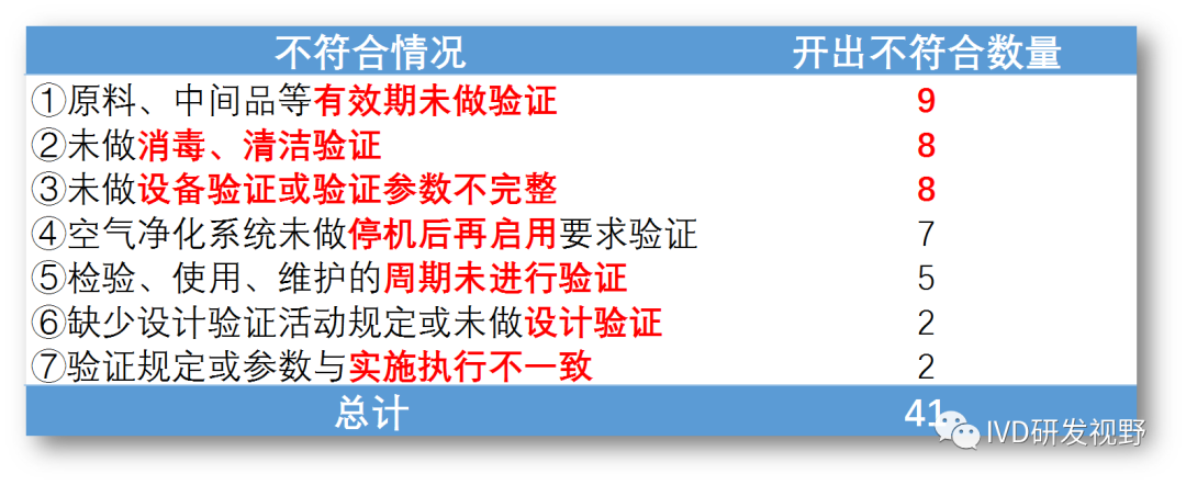 仅统计2016-2023历年飞行检查IVD企业中关于验证的不符合项,如果是无菌和植入器械,关于验证的缺陷项会更多,所有产品类别验证相关不符合项达到367条。按医疗器械GMP的章节进行统计分析,可以看出不符合项主要集中在设备、生产管理、设计开发章节。 按验证不符合的情况进行统计分析,可以看出不符合项主要集中在未做物料有效期验证、清洁消毒验证、设备验证方面。 以下是上述不符合项的具体内容。①原料、中间品等有效期未做验证。