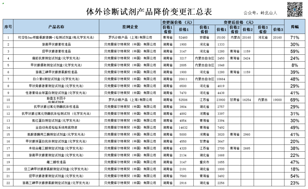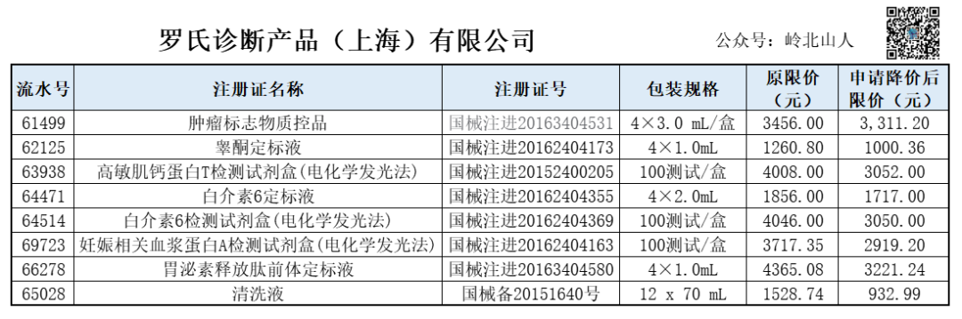 2023年4月17日,罗氏主动在安徽下调产品价格,白介素6检测试剂盒(电化学发光法)从4046元调整为3050元,降幅25%;非试剂盒的产品中,清洗液降幅最高,达到39%。2023年7月14日,青海省药品采购中心发布文件, 根据企业申请,对部分体外诊断试剂的价格进行调整。罗氏诊断的可溶性fms样酪氨酸激酶-1项目,从52460元下降到15100元,降幅为71%;同样是罗氏的胎盘生长因子,从52506元降到16254元,降幅为69%。