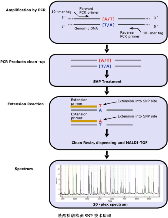 分子诊断技术是指以DNA和RNA为诊断材料,用分子生物学技术通过检测基因的存在、缺陷或表达异常,从而对人体状态和疾病作出诊断的技术。其基本原理是检测DNA或RNA的结构是否变化、量的多少及表达功能是否异常,以确定受检者有无基因水平的异常变化,对疾病的预防、预测、诊断、治疗和预后具有重要意义。 按技术原理,可以将上市分子诊断技术大致划分为PCR技术、分子杂交、基因测序、核酸质谱、生物芯片5大类。 核酸质谱,顾名思义是一种能检测核酸的质谱,它是基于MALDI-TOF MS质谱发展起来的一种相较于传统的荧光定量PCR,一代测序和二代测序,它有什么优势呢? 单核苷酸多态性 人类的好多遗传性疾病是在SNP上的,单核苷酸多态性就是单个的核苷酸序列发生了变异,引起了DNA序列发生了多样性,比例高达1%。它也是疾病易感基因和药物反应差异性的决定因素。所以通过分析SNP的变异位点,提供疾病预测,诊断和提供用药指导等。 目前荧光定量PCR适宜于检测单基因几个位点(2-8个),但是随着医学技术的深入发展,涉及到多基因多位点的疾病越来越多,这时传统荧光定量PCR的不足就会表现出来,工作量大,检测速度慢。而核酸质谱高灵敏度、分离速度快、杂质干扰少等优势,可以一网打尽(如耳聋基因,4个基因20个位点,核酸质谱可以在一个检测孔中解决)。 应用:药物基因组检测、肿瘤易感基因 基因突变 基因突变检测与SNP检测原理相同,区别在于基因突变检测存在的是突变型(发生突变后的样子)和野生型(原来的样子),这一点与SNP的纯合型(比如显性纯合)和杂合型(杂合子)有所区别。图谱峰的面积与样品中分子量所代表的核酸片段含量成正比,故可以通过突变型/野生型的比值确定突变点的比例,可检测到0.5%以上的突变比例,与金标准验证技术符合度>95%。 应用:肿瘤突变(EGFR突变),耳聋基因筛查,地中海型贫血、代谢综合 征、冠状动脉疾病等 DNA甲基化 人类基因组中含有3-5%的胞嘧啶,会在DNA甲基化转移酶的作用下与甲基基团CpG二苷酸的C’5位上,形成一个CpG岛(300-3000bp),这个CpG岛的甲基化水平异常提高,会抑制抑癌基因转录失活或者一些原癌基因被激活。另外DNA甲基化还与记忆缺陷,精神分裂症、抑郁狂躁等复杂疾病有关。 相比较其他方法,核酸质谱的优势就在于可检测低至5%的甲基化水平,特异性好,灵敏度高。 应用:宫颈癌、胃癌、乳腺癌、结直肠癌、肝癌、食道癌、垂体腺瘤等 基因拷贝数鉴定 人类的基因组会出现一段序列缺失或者增加导至序列发生变化而引起产物变化。这种表型上的差异就是拷贝数变异(CNV),CNV涉及的DNA片段大小通常介于1kbp-3Mbp之间,在基因组中分布广泛,其与临床上罕见病、单基因病相关,也与很多肿瘤等复杂病相关。因此对CNV的变异研究,能够对多种疾病并发机制形成新的认知,以更好地指导疾病的分子诊断和新治疗方法的开发。 核酸质谱可以通过SNP的多态性等位基因比例(SAR)检测技术对待检测标本中目标基因的拷贝数进行定量分析。 高通量检测结果验证 美国FDA批准核酸质谱技术作为二代测序的验证平台,以弥补一代测序仪灵敏度不足的短板。高通量测序的检测灵敏度可达1-5%,因此需要相匹配的验证平台,但是一代测序灵敏度低于15%,无法提供有效的验证,因此,核酸质谱作为两者结果差异时的验证平台。 场景一:结直肠癌KRAS基因低频突变 解密遗传变异与肿瘤发生发展关系的研究,质谱肿瘤基因突变检测分析具有成本低、高通量、高灵敏度和特异性等显著优势。 场景二:多呼吸道病毒、多亚型同时检测 巧妙的整合PCR技术的高灵敏度以及质谱技术的高精确度,开创了检测精确度高、重复性强、具有高度自动化、标准化特征的全新检测时代。可以对微生物、病毒以及其他单倍体生物方便快捷的进行分子分型、物种鉴定、变异物种发现及归类等全面分析。 场景三:高血压用药指导 检测到1%-3%突变等位基因,在个体化用药、耐药及新药筛选等临床项目中,可以尽早检出突变,帮助临床医生改善治疗方案。 目前核酸分析所使用的质谱电离技术主要还是采用 ESI 和MALDI。简单来讲,两种电离技术都是软电离,ESI 检测的特点是生物大分子带多个电荷,质荷比范围基本在2000 Da 以下区间,从而能检测几万乃至更大的生物分子;而MALDI 常得到单电荷峰,与飞行时间(TOF)分析器搭配,检测范围可以到几十万道尔顿。 由于生物样品的复杂性,质谱技术还面临着一些挑战和困难。但生物质谱技术是科学研究的有力工具,随着临床实验室对质谱的了解和应用不断的加深,未来该检测平台或可成为规范实验室不可或缺的标准装备。分子诊断技术的应用不仅深化对疾病发病机制分子生物学的基础研究,而且不断扩大了分子诊断疾病的病种,随着人类基因组计划的完成和蛋白质组计划的启动,分子诊断方法将极大地推动现代检验医学的迅速发展,并通过这些基本技术的衍生、联合产生新的分析方法,从而提高分子诊断的特异性、敏感性和准确性,为临床医学诊断和治疗提供更准确的数据和信息。 参考文献 1、中国核酸质谱应用专家共识协作组.中国核酸质谱应用专家共识[J].中华医学杂志,2018,98(12):895-900. 2、许蕴,李赟,张晓丽,徐迹,刘文兰.飞行时间质谱核酸检测技术在临床检测中的应用[J].中华检验医学杂志,2019,42(8):694-699. 免责声明:文章内容仅供参考,不构成投资建