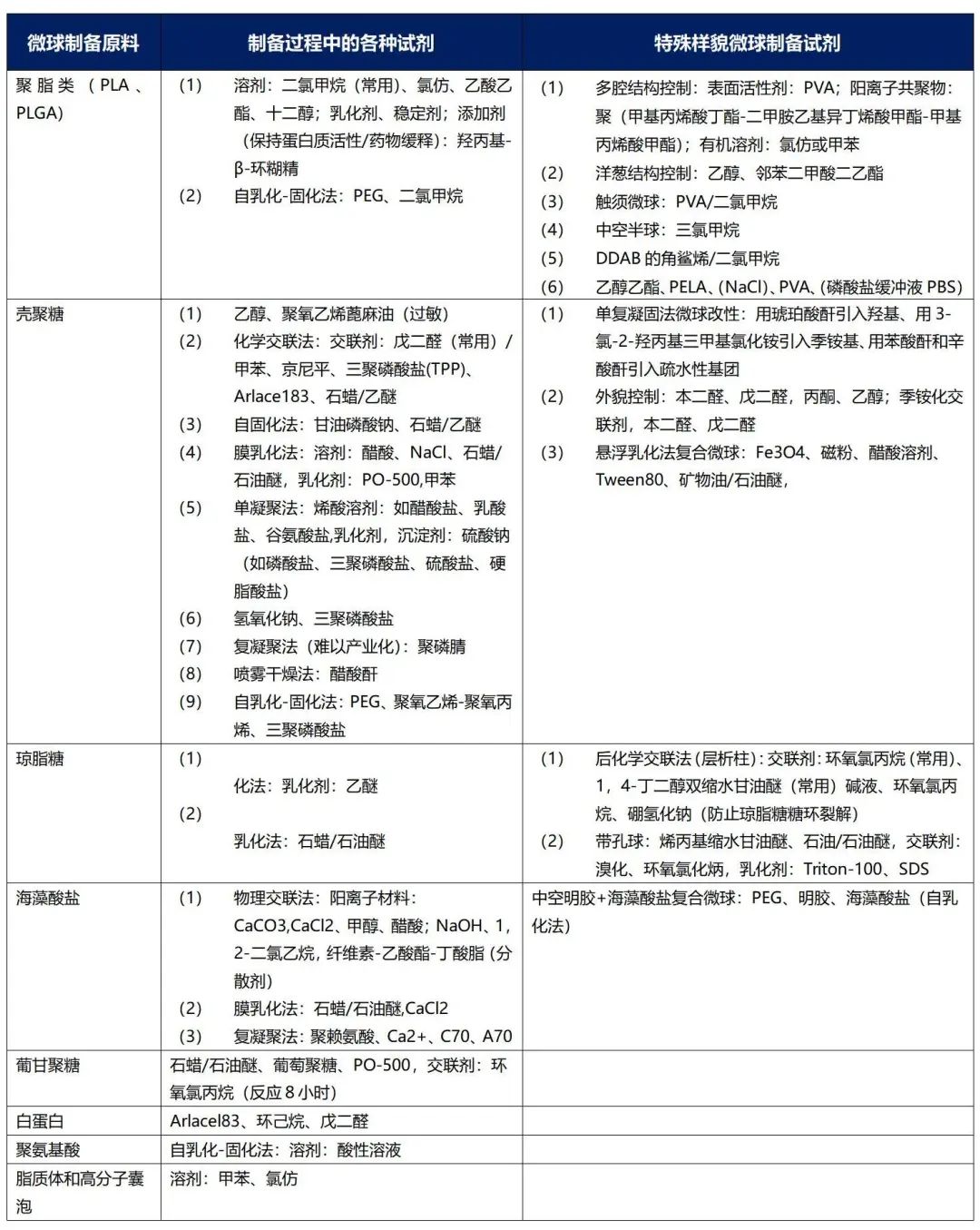 本篇将着重介绍以单体为原料制备、以高分子为原料制备的微球制备技术以及复合微球的制备和多孔微球的制备。 一、以单体为原料制备 1.制备思路该方法主要采用ST、MMA等单体原料制备聚苯乙烯(PST)微球、聚丙烯酸酯微球(PMMA)等微球。主要的制备思路:单体合成,单体带有双键,双键经过引发剂可引发自由基聚合形成高分子(也可以通过缩聚方式制备高分子)。悬浮聚合法、乳液聚合法、膜乳化法、种子法、微流控法等几种方法,其中,国内色谱层析介质的龙头企业纳微科技采用种子法制备微球。 采用上述几种制备方法获得的微球粒径大小如下图[1]: 2.以单体为原料制备微球所用试剂 以苯乙烯、丙烯酰胺单体为例,在制备微球过程中,通常会使用以下多种试剂: (1)稳定剂:PVA(聚乙烯醇,水溶性,常用)、PVP、CMC(羧甲基纤维素),主要作用是:分散剂或乳化剂,分散原材料至连续相,防止微球液滴粘连吞并 (2)引发剂:KPA(过硫酸钾,水溶性),主要作用是:预热分解成自由基开始链引发 (3)乳化剂:十二烷基硫酸钠、SDS,主要作用是:分散原材料至连续相,设计成核地点和机制 (4)阻聚剂:HQ、NaNO2,主要作用是:防止单体和自由基在设计以外的地方成核 二、以高分子为原料制备 该方法主要用于制备琼脂糖、壳聚糖、白蛋白等天然高分子微球或聚乳酸、聚己内酯等聚酯类生物可降解高分子微球。其原料聚乳酸、葡聚糖、琼脂糖等高分子材料。主要的制备思路:将高分子溶解在有机溶剂或水中制备成溶液,在和与之不相容的水或溶剂混合乳化,制备成O/W(水包油)、W/O、W/O/W或O/W/O型乳液后,用适当的物理或化学交联方法使液滴固化成微球和微囊。固化方法需要根据高分子的物理化学性质来选择或开发不同的方法。乳化方法主要包括:机械搅拌法、均质乳化法、膜乳化法;固化方法包括:自固化法、物理/化学交联法、溶剂挥发/箤取法、单/复凝聚法。其中,机械搅拌法方法较为常用。 1.乳化方法 2.固化方法 (1)溶剂挥发法:使用熔点低的溶剂,如二氯甲烷,常温减压使其挥发。该方法可用于制备聚酯类微球,脂质体和高分子囊泡。 (2)溶剂箤取法:使用水溶性高的溶剂,使溶剂可扩散进入水中被除去。该方法可用于制备聚酯类,琼脂糖微球。 (3)化学交联法:对高分子交联得到固化的微球。如:壳聚糖带有氨基,可采用戊二醛进行化学交联,除此外,葡甘聚糖,白蛋白也可采用化学交联法。 (4)物理交联法(离子固化法) 内部固化法:将会与酸反应生成阳离子的粉末加入材料中,将混合物滴入酸性水溶液,氢离子进入液滴内部与粉末反应生成阳离子并从内而外与材料交联固化。 外部固化法:将材料滴入含阳离子的溶剂,固化从微球表面向内部逐渐变慢。其优势为包埋率高,例如:海藻酸盐带有负电荷,可采用Ca2+等二价阳离子来物理交联。 (5)自固化法 冷却固化:通过冷却凝固成固体,常用于琼脂糖微球的制备。 高温固化:亲水性高分子蒸发去水分化使微球固化,可用于制备壳聚糖,琼脂糖,白蛋白,聚氨基酸等微球,其劣势为高温下药物容易失活。 (6)单凝聚法(沉淀法):材料在烯酸溶剂中溶解,滴加浓酸使其析出成球;或在材料中加入会蒸发的极性溶剂去除材料中的水;在材料可溶的溶剂里加入不可溶的溶剂使其析出。其优势在于可以避免戊二醛等化学交联剂的使用,可用于制备聚酯类,壳聚糖,海藻酸盐,白蛋白等微球。 (7)复凝聚法:两种带相反电荷的高分子材料,离子间交联形成复合微球或微囊,体系接近等电点而使溶解度降低,析出沉淀。其优势在于不使用有机溶剂和化学交联剂,保持包埋药物活性,药物在酸性条件下(例如胃部)不释放,可用于制备壳聚糖+海藻酸盐微球;其劣势为微球直径受滴管影响,难以大规模产业化。可用于制备壳聚糖+海藻酸盐微球,及壳聚糖+海藻酸盐/酪蛋白/明胶/聚磷腈、海藻酸盐+壳聚糖/聚赖氨酸/明胶微球等。 3.以高分子为原料制备微球所用试剂 三、复合微球的制备 最常用的复合微球是高分子磁性微球,医疗上主要用于IVD检测试剂、细胞筛选等用途。 1.以单体为原料制备高分子-无机复合微球 高分子-无机复合微球能够兼具高分子和无机材料两者的优势,既拥有有机材料的可塑性、易加工性及生物兼容性,同时具备无机物的刚性、磁性以及导电性等性能。制备方法较多,思路主要分为四类: (1)以无机颗粒为核,在核上进行单体聚合的方法 (2)以高分子微球为核,在高分子微球上原位生成无机颗粒的方法 (3)将无机颗粒和单体混合制备成液滴,然后通过聚合将无机颗粒包埋在微球内的方法 (4)利用静电相互作用等其他方法。 2.以高分子为原料制备有机-无机复合微球 以高分子为原料制备有机-无机复合微球,最常用的方法是悬浮法和细乳液法,制备思路均为将无机颗粒分散在分散相中,和连续相混合后,固化成球。区别在于悬浮法粒径较大,细乳液法粒径较小。 四、多孔微球的制备 多孔及高开孔微球在三维细胞培养、分离纯化介质等领域发挥着极其重要的作用。 常用的制孔剂有气体生成型致孔剂(如碳酸氢铵、碳酸氢钠、过氧化氢)、渗透型致孔剂(氯化钠、氯化钾等)和可提取型致孔剂(Pluronic,脂肪酸盐等)。造孔最常用方法为制孔剂浸出法,将制孔剂与原料相混合,并用溶剂将其浸出以形成孔结构。 在高分子中空微球的制备中,常用的制备溶剂为乙醇/二氯甲烷的混合液,间或混合异丙醇、丙酮