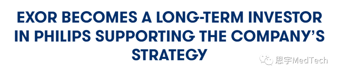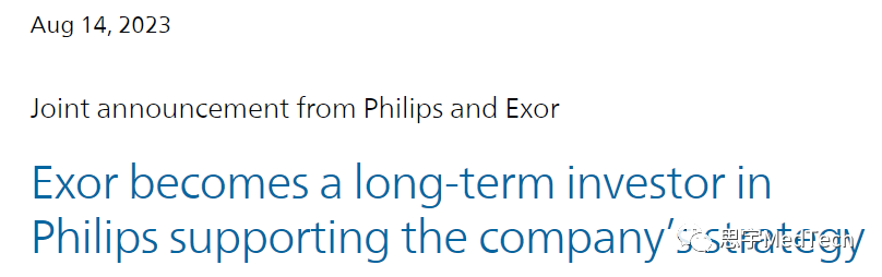 2023年8月14日,皇家飞利浦(NYSE: PHG) 宣布,已和意大利富豪阿涅利家族的控股公司Exor N.V. (AEX: EXO)达成了一项协议,同意Exor收购飞利浦15%的股份。 #大有来头的EXOR集团 EXOR集团(AEX: EXO)是欧洲最大的投资公司之一,由阿涅利家族控制,总部位于荷兰。2008年,菲亚特集团旗下的两家控股公司合并成立EXOR控股公司。EXOR控股公司对菲亚特集团拥有主要控股权,并对诸如尤文图斯俱乐部、美国房地产服务企业高纬物业顾问有限公司(Cushman & Wakefield)等菲亚特集团旗下的业务拥有控制权。 一个多世纪以来,Exor 集团成功开展了多项投资,该集团还控股了包括菲亚特、蓝旗亚、依维柯、法拉利、玛莎拉蒂、阿尔法·罗密欧、克莱斯勒、吉普、道奇等众多世界级汽车品牌以及经济学人集团(The Economist Group)和 GEDI 出版集团 (GEDI Gruppo Editoriale)等公司。 2020年,EXOR集团曾宣布与法国爱马仕集团宣布已达成协议,EXOR集团将为爱马仕旗下品牌「上下」增资约 8000 万欧元,并由此持有品牌多数股份。据悉,该品牌是首批登上国际奢侈品舞台的中国品牌之一。 2023年8月,EXOR集团以45,976.6(百万美元)营收,入选2023年《财富》世界500强排行榜,排名第317位,公司资产净值约为330亿欧元。 #拓展投资版图,持续押注飞利浦医疗 此次EXOR投资飞利浦,表明了其有兴趣增在医疗保健和技术领域的版图决心。据悉,EXOR对飞利浦的投资不会导至任何股权稀释,而是通过在市场上购买股份以及与一家主要金融机构达成协议的方式进行。双方公司均承认,此次股份收购旨在促进彼此的互惠互利和长期合作。 该协议包括: