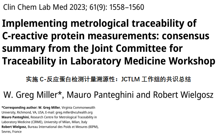 CCLM 2023;61(9):1558-1560 实施C-反应蛋白检测计量溯源性:JCTLM工作组的共识总结 摘 要 检验医学溯源性联合委员会(JCTLM)近期列出了二级可互换有证参考物质(CRM)ERM DA-474/IFCC(DA-474)“人血清C-反应蛋白”,和两个通用的免疫检测为基础的方法原理,作为医学实验室使用的终端用户检测程序对C-反应蛋白(CRP)检测的计量溯源性的基础。近期计量溯源性,在不同的终端用户检测程序间对临床样品检测,已经产生了良好一致性结果。新的较高等级纯物质和二级可互换CRM已经被JCTLM列入提名。但是,这些新候选CRM的数据支持性能,包括依据候选的参考检测程序(RMP)的新的质谱方法,引入这些新CRM对现有计量溯源性到DA-474有影响。血清或血浆中临床上关联的CRP被测量,是一个相同亚单位的五聚体,为应用较高等级CRM和RMP添加了复杂性。JCTLM 在2022年召集工作组,审核相应实施CRP检测的计量溯源性。工作组的共识是,等同数据的程度,在它预期目的为现有终端用户检测系统的校准等级时,必须包括考虑新CRM的影响;一个新的RMP必须与另一个现有的明确认可的候选RMP、或具有全球可用的终端用户检测系统进行比较的结果。 JCTLM保留的数据库,近期列出了二级可互换有证参考物质(CRM)ERM DA-474/IFCC (DA-474) “人血清C-反应蛋白”,和两个通用免疫检测为基础的方法原理(免疫透射和免疫散射),作为实施C-反应蛋白(CRP)检测计量溯源性的基础。DA-474认可报告说明,它的值是由6个市售免疫检测程序产品设定,每一个均使用了ERM DA-470为校准品[1]。 对ERM-DA-470设定的值可溯源到CRP的1st 国际标准,这是WHO的WHO 85/506, 叙述在证书报告中。该WHO 85/506标准在1985年制备,每个安瓿内含有冷冻干燥后溶液的人CRP为50 μg(在0.5 ml健康个体的混合人血清内)[2]。制备的一级校准品作为WHO 85/506的溶液,与临床样品的互换性不清楚。 近期可用的市售终端用户免疫检测产品的校准等级,是依据DA-474二级可互换CRP或使用它的前身ERM DA-472/IFCC,用作较高等级计量溯源性的参考,遵循ISO 17511[3]。用于产生CRM的ERM系列,说明CRP是五聚体形式[4,5]。近期,CRP免疫检测的计量溯源性,已经被一个代表性个数的终端用户检测程序检测的临床样品结果间,产生了临床上拟合目的的一致性[6]。两个二级可互换CRM已经保持了这个持续的良好性能15年了。 从计量溯源性观点上,要求的目标是具有一个校准等级,包括一个一级纯物质CRM,和一个为该被测量的较高等级参考检测程序(RMP),可在很长时间区间内,并在全球的任何地方,能够持续可反复的计量溯源性。形成这些较高等级参考对CRP是一个挑战,因为在临床血液样品中CRP的循环形式,它是一个复杂蛋白,表现为等同亚单位的五聚体 [7]。所以,临床上关联的被测量是血液中血清或血浆中的五聚体CRP,在医学实验室使用的终端用户免疫检测产品,,被指定去优先检测五聚体,不与单体反应。 CRP被测量的复杂性,意即为CRP形成较高等级RMP,必须相应地检测该五聚体的被测量,以拟合免疫检测中校准等级的目的。依据质谱的较高等级RMP,消化了被测量成为多肽碎片,去检测某个量(多肽);与临床样品或二级CRM内,如DA-474内存在的量(五聚体蛋白)不同;在使用免疫检测中,DA-474与临床样品是可互换的。如果单体的比例与用作RMP的校准品,和被RMP检测的样品不同,在这个情况下,一个二级可互换CRM,被测量值被设定到CRM将是不正确的,将在市售可用的免疫产品的校准等级中,引入偏移。 因此,一个一级纯物质CRM的五聚体到单体比率,作为CRP用于校准被测量的一个RMP,是一级CRM和候选RMP的适用性的关键。一个一级CRM必须是五聚体,它的预期用途是为免疫检测制备二级可互换的校准品。否则,一级CRM的设定值,将不正确地反映五聚体形式。另外,在以一级CRM去制备一级校准品中,五聚体结构必须被完整保存。所以,一个一级CRM的完整特性和它用于制备一级校准品,去实施CRP检测的溯源性,必须明白地叙述,以展现它为它的预期用途是适合的和相应的。 JCTLM要求展现等同的程度到一个现有的CRM或RMP,在将一个新的候选CRM或RMP命名,被列入它的数据时[8,9]。对于CRP,近期没有一级CRM或RMP,作为被测量被列入。2022年12月在米兰举行工作组会议时,生效的方针建议,对新的候选RMP与使用医学实验室的现有检测程序进行比较研究,以检查被测量选择性的相似性。但JCTLM方针没有规定一个特定程序,对一个新的候选一级CRM还没有被列入现有清单中的,如何进行比较。但是,对于一个复杂的被测量,如CRP,必须实现考虑单体的影响。 两个国家计量研究院在会议中分享了数据,他们形成了候选的一级纯物质和二级CRM,为CRP以质谱方法为候选RMP。这些CRM的一些,已经被JCTLM审核任命。依据数据说明,以这些任命的CRM校准的程序,检测的临床样品结果,会与使用近期可用的很好一致的终端用户免疫检测,被校准到DA-474或DA472的检测结果有显著差异。这个情况说明对JCTLM审核过程是一个挑战,由于潜在的偏移会引起对病人结果的错误解释。 数据在会上显示的,展现了引入新的候选较高等级参考的风险,所以为终端用户免疫检测产品确定新的校准等级,在与依据现有计量溯源性到WHO 85/506的结果比较中,可引出临床样品结果不一致。医学实验室的实践会被JCTLM列出一个新CRM与较高等级RMP,是一个负面影响,在现有的明确确定的校准等级下引入一个偏移。研讨会总结出,为CRP的一个新的CRM