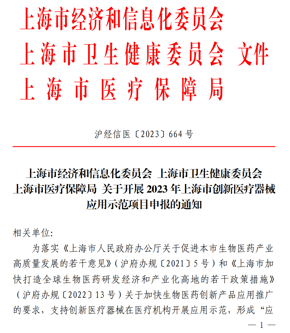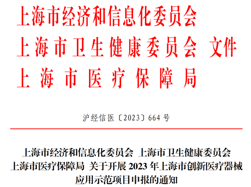 近日,上海市经信委发布《上海市经济和信息化委员会 上海市卫生健康委员会 上海市医疗保障局 关于开展2023年上海市创新医疗器械应用示范项目申报的通知》(以下简称《通知》)。