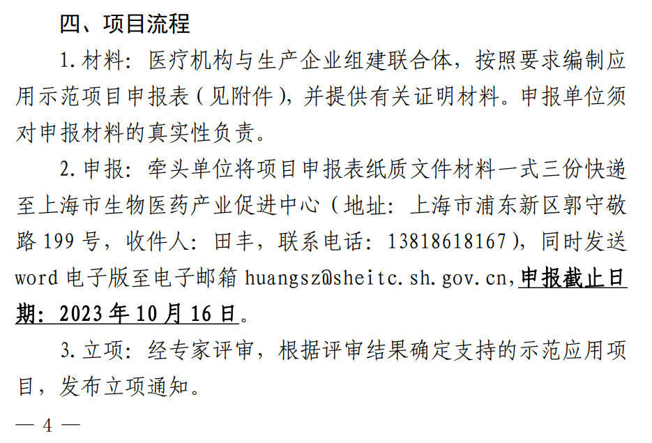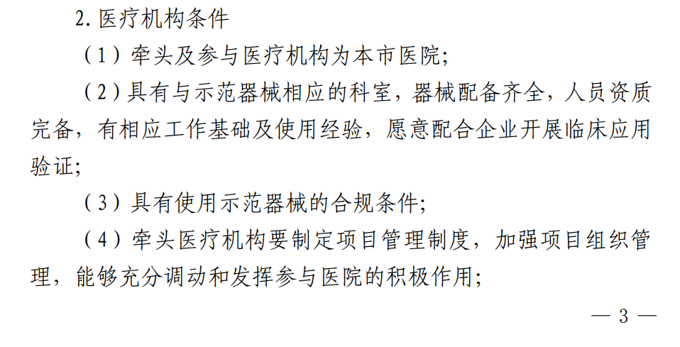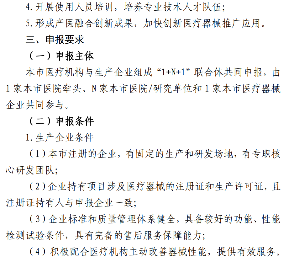 根据《通知》,由上海市医疗机构与生产企业组成“1+N+1”联合体共同申报,由1家本市医院牵头、N家本市医院/研究单位和1家本市医疗器械企业共同参与。
