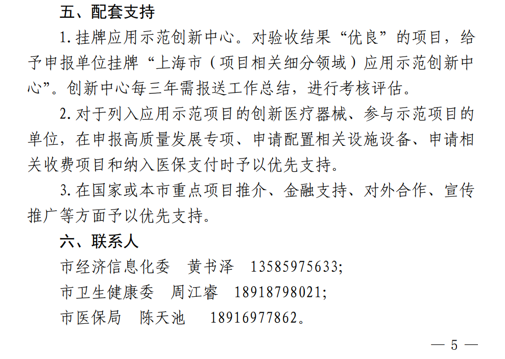 配套支持方面,《通知》明确,对于列入应用示范项目的创新医疗器械、参与示范项目的单位,在申报高质量发展专项、申请配置相关设施设备、申请相关收费项目和纳入医保支付时予以优先支持。在国家或本市重点项目推介、金融支持、对外合作、宣传推广等方面予以优先支持。