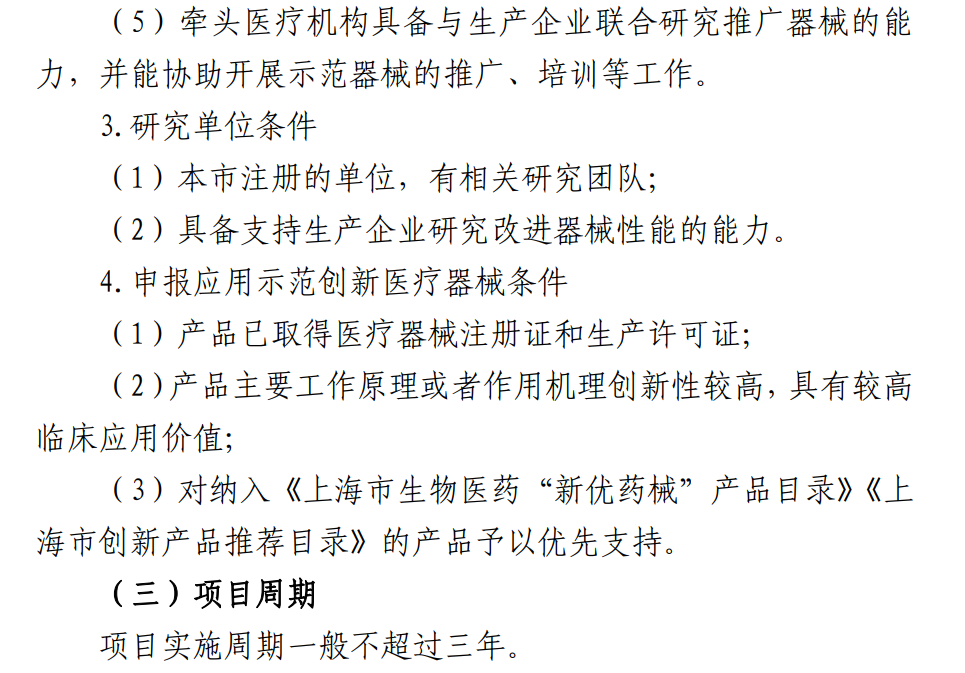 申报2023年上海市创新医疗器械应用示范项目的生产企业、医疗机构、研究单位需要满足一定的条件。例如,申报生产企业须为“本市注册的企业,有固定的生产和研发场地,有专职核心研发团队”,还要“企业持有项目涉及医疗器械的注册证和生产许可证,且注册证持有人与申报企业一致”。