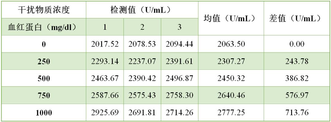 由上表可知血红蛋白、胆红素和甘油三酯均对样本中抗链球菌溶血素O的检测有干扰。