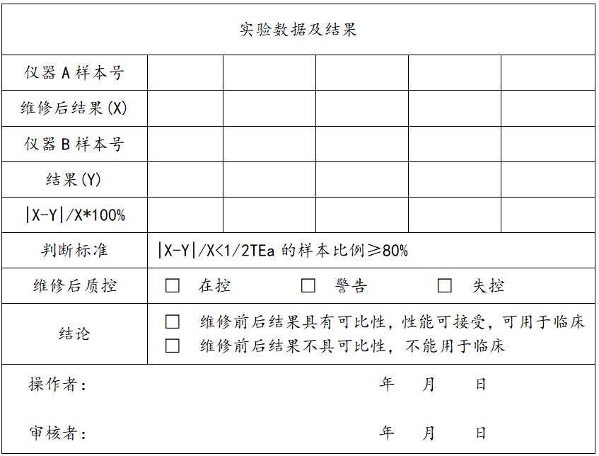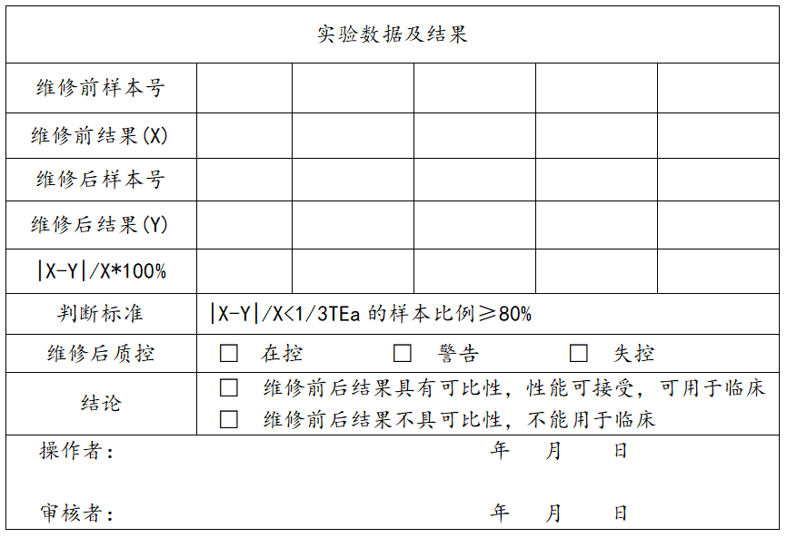 上述流程完成后,完善《仪器设备维修记录表》的填写,记录处理过程、维修完成时间及工程师签名,同时将维修工单、《仪器维修后比对记录》、质控结果及比对原始结果存档。